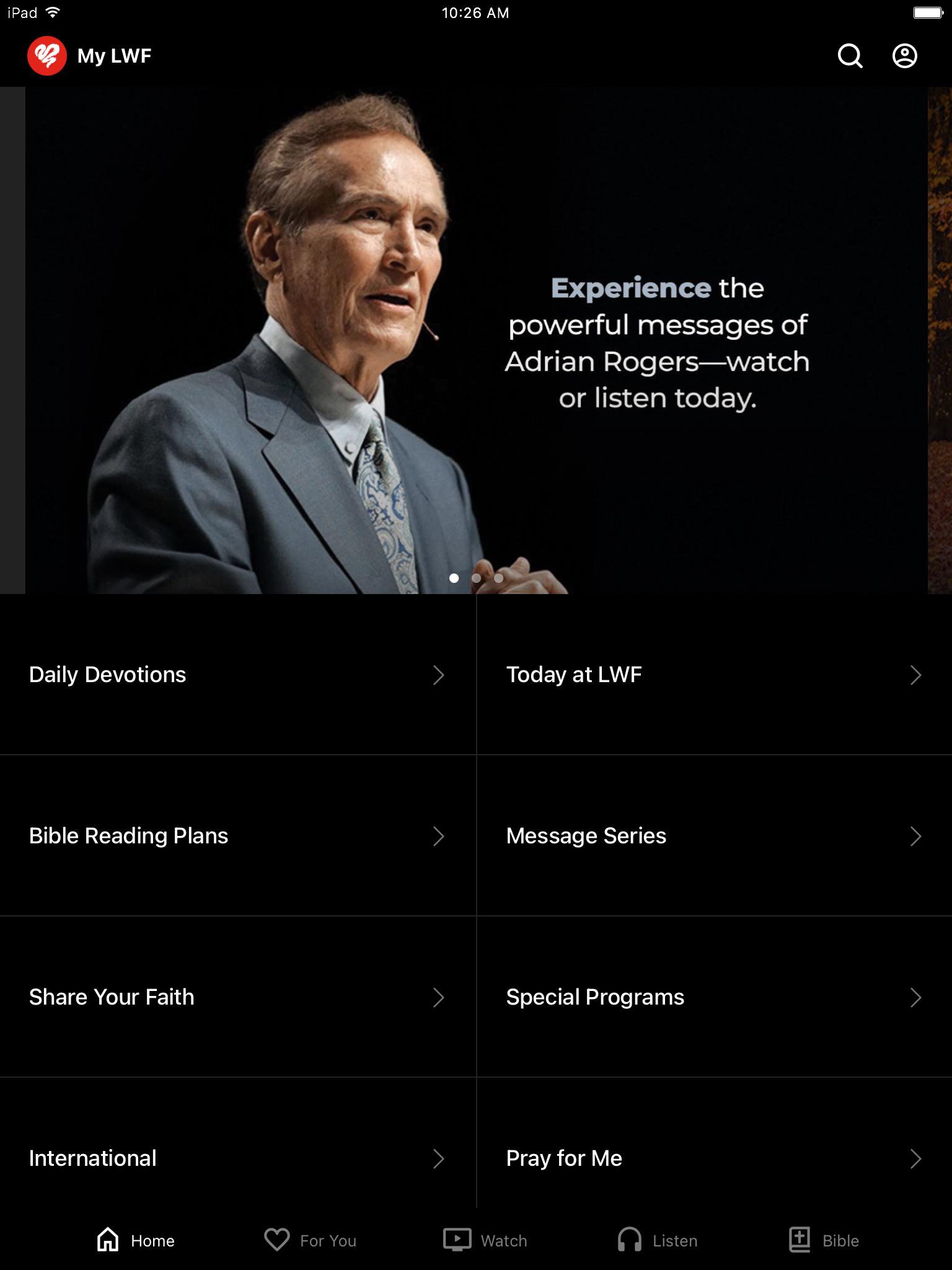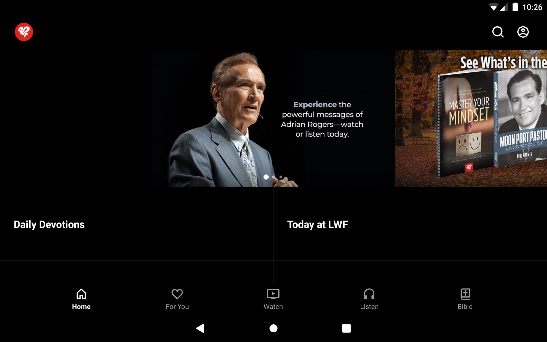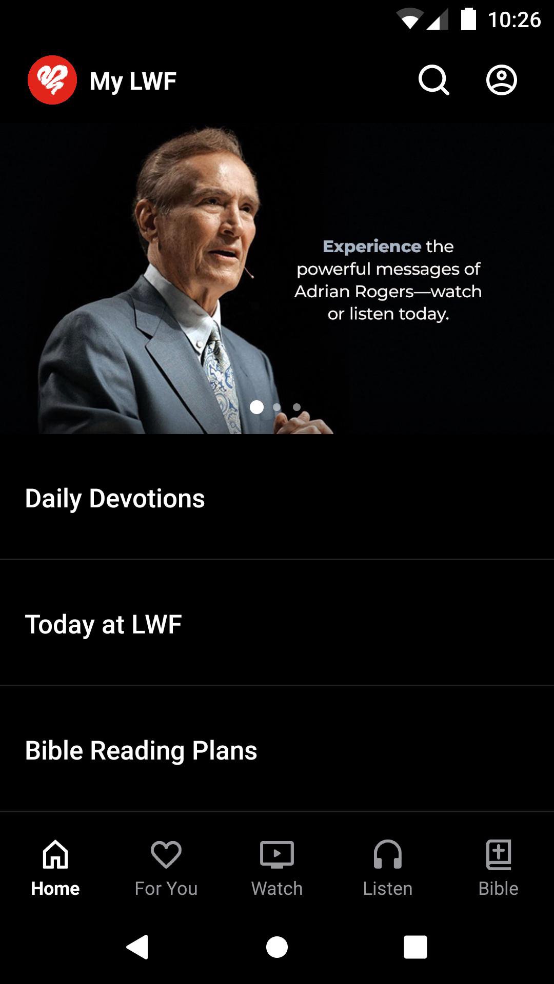 Profound truth. Simply stated. With the LWF app, you can access powerful content to help you in your daily life from pastor, teacher, and author Adrian Rogers. Adrian Rogers has introduced people all over the world to the love of Jesus Christ, and has impacted untold numbers of lives by presenting profound biblical truth with such simplicity that “a 5 year-old can understand it, and yet, it still speaks to the heart of the 50 year-old.” His unique ability to apply biblical truth to everyday life is yet unparalleled by other modern teachers. With this app, you can: - Watch or listen to current broadcasts - Watch or listen to past messages - Read daily devotionals - Stay up to date with push notifications - Share your favorite messages via Twitter, Facebook, or email - Download messages for offline listening - Access our mobile web site - Support LWF online
