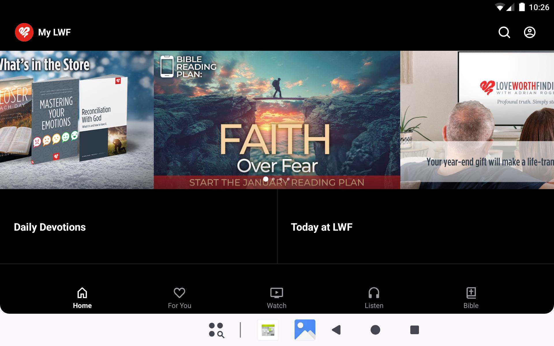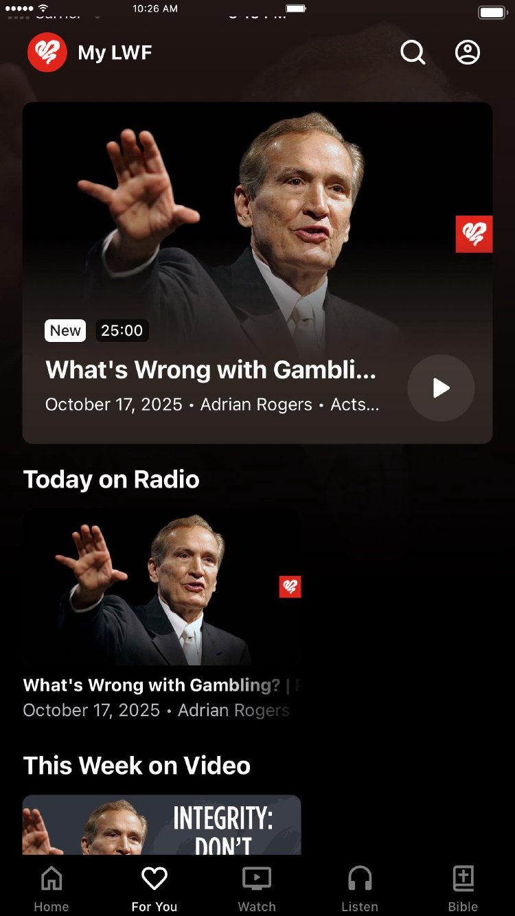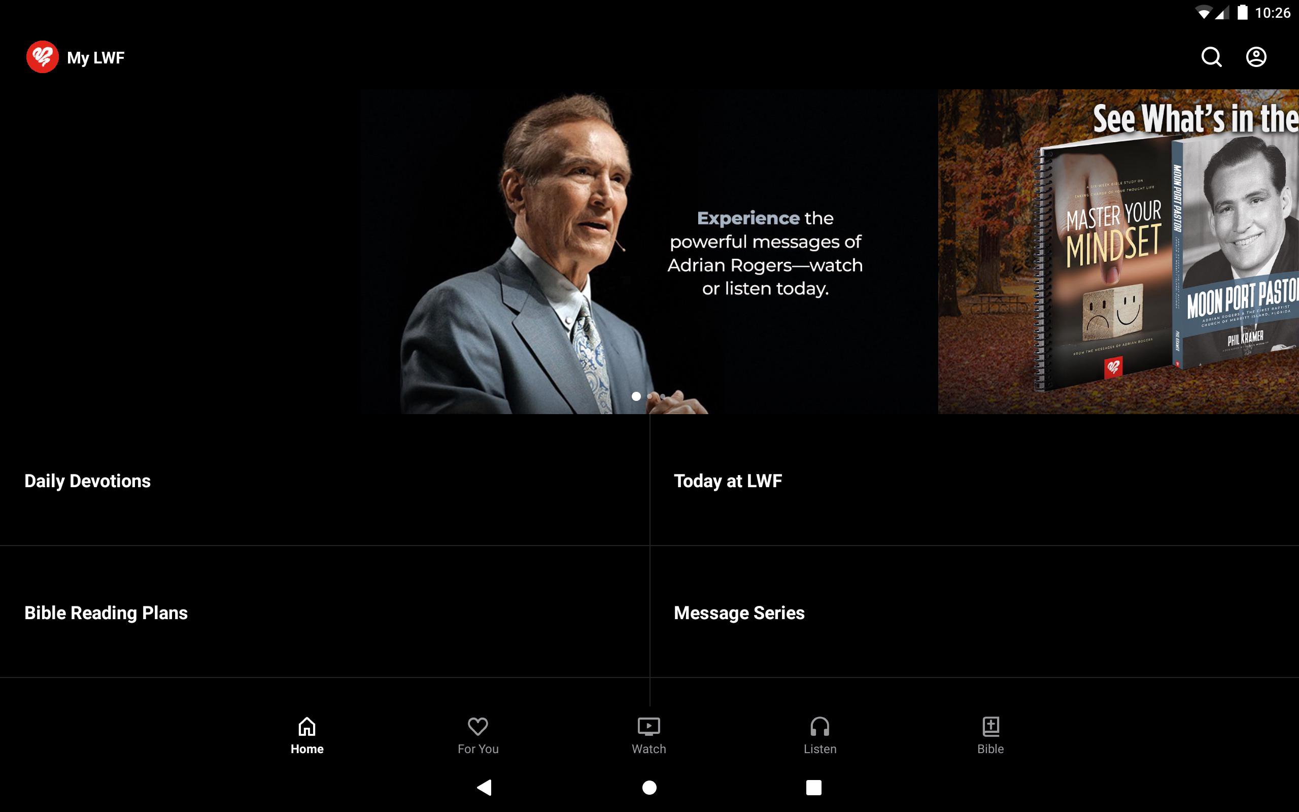 Profound truth. Simply stated. With the LWF app, you can access powerful content to help you in your daily life from pastor, teacher, and author Adrian Rogers. Adrian Rogers has introduced people all over the world to the love of Jesus Christ, and has impacted untold numbers of lives by presenting profound biblical truth with such simplicity that “a 5 year-old can understand it, and yet, it still speaks to the heart of the 50 year-old.” His unique ability to apply biblical truth to everyday life is yet unparalleled by other modern teachers. With this app, you can: - Watch or listen to current broadcasts - Watch or listen to past messages - Read daily devotionals - Stay up to date with push notifications - Share your favorite messages via Twitter, Facebook, or email - Download messages for offline listening - Access our mobile web site - Support LWF online