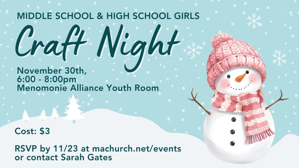 Middle School and High School girls are invited to join us for a night of making snowman ornaments while drinking hot chocolate and eating popcorn!