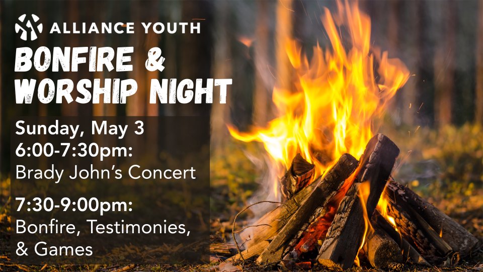 We have a fun night coming up on Sunday, May 3rd. Instead of the regular game night, we will be having a Bonfire & Worship Night for the entire family 6-9pm. Everyone is welcome to come for a concert with Brady John at 6pm in the church sanctuary. Then the youth and their families will gather out at the bonfire pit on the north side of the church for testimonies and games.