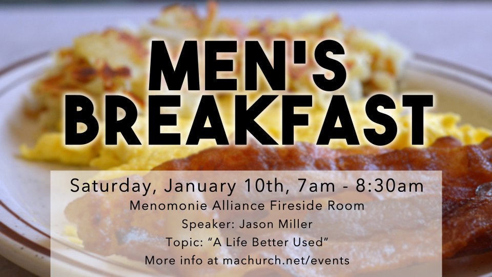 Men, join us for breakfast the 2nd Saturday in January in the Fireside Room! Jason Miller will be talking about "A Life Better Used." Breakfast will be sausage and eggs.