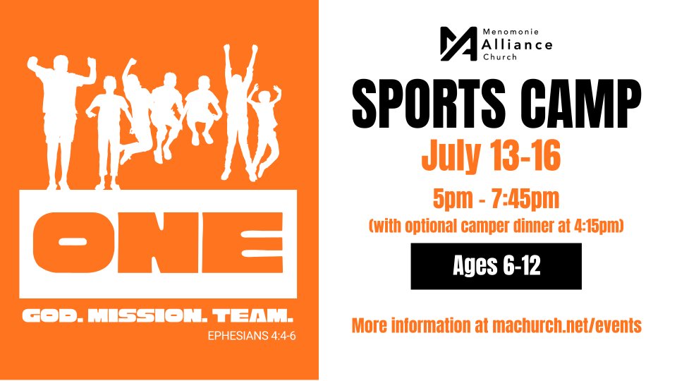 *Looking for something creative to be a part of or want to work on leadership skills? Sports Camp will need the help of a handful of 10-12 year olds to be a part of acting, prop making, and costume gathering for the Bible lesson (Drama Team) and technical support including lighting, sound, slides, and photography (Tech Team). There is limited space on these teams, so if this is for you, make sure to grab your spot soon!