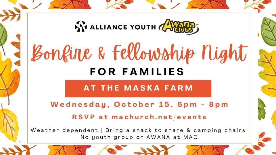 All Alliance Youth and AWANA families are invited to a bonfire at the Maska farm Wednesday, October 15th! Join us for a fun night of fellowship! Bring camping chairs to sit by the bonfire and snacks to share (chips, cookies, etc). Parents should plan to stay with their students.
