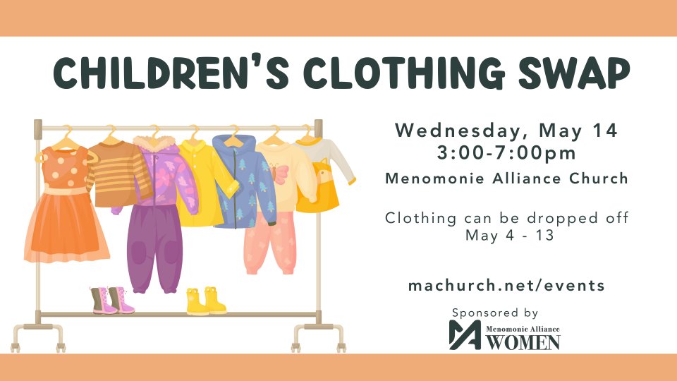 Save and donate clothes your kids have outgrown to swap with others! Clothing in all children's sizes (no adult sizes, please) can be dropped off at church the following times: