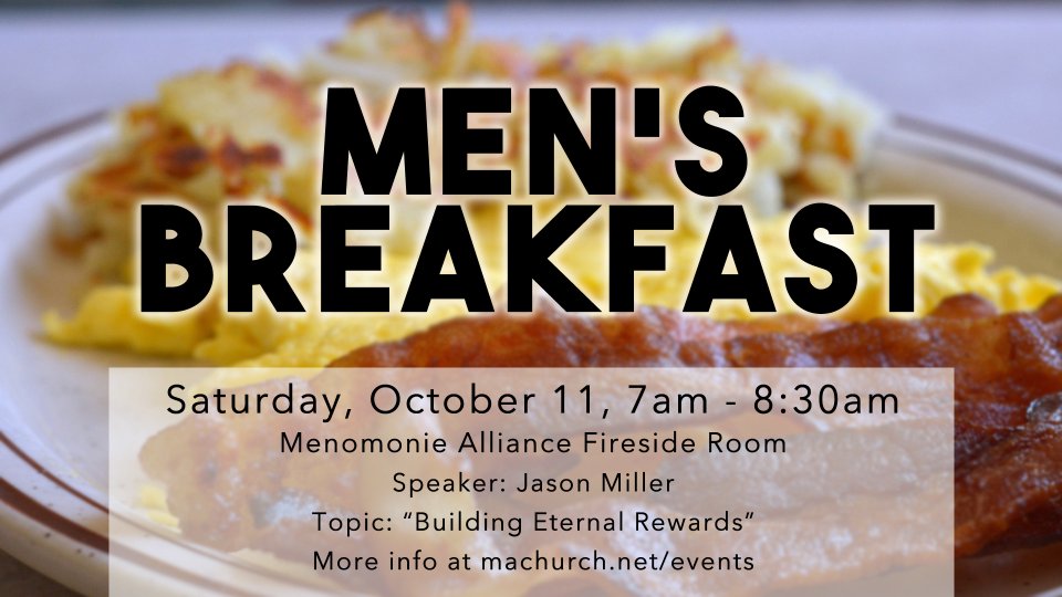 Men, join us for breakfast the 2nd Saturday in October in the Fireside Room! We will be hearing from Jason Miller on "Building Eternal Rewards." There will be biscuits, gravy, eggs, and fruit.