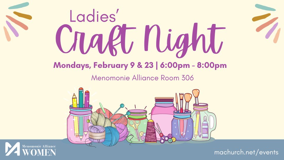 Ladies, join us for a night of fellowship! Bring a craft or another project to work on, your tea/coffee, and a snack to share (if you would like). No RSVP needed. Meeting in Room 306 February 9th & 23rd.