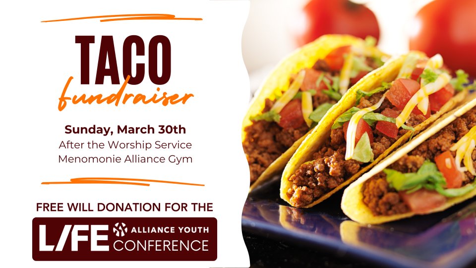 Join us for tacos after church on March 30th in support of the 19 students and leaders raising funds to attend the LIFE Conference in Indianapolis in July. LIFE is a conference that happens every three years with the Christian and Missionary Alliance for high school students. Free will donation. Event held in the MAC Gym after the service.
