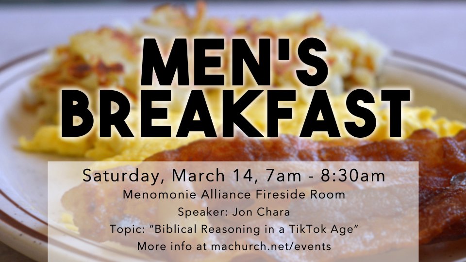 Men, join us for breakfast the 2nd Saturday in March in the Fireside Room! Jon Chara will be speaking on "Biblical Reasoning in a TikTok Age."