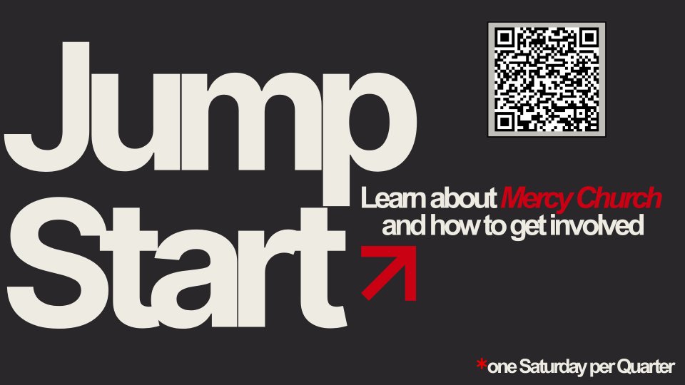 Jump Start is your starting point here at Mercy Church to connect, grow, and get plugged in. You'll meet members of our staff, learn about the vision of Mercy Church, and explore opportunities like baptism, membership, volunteering, and outreach.