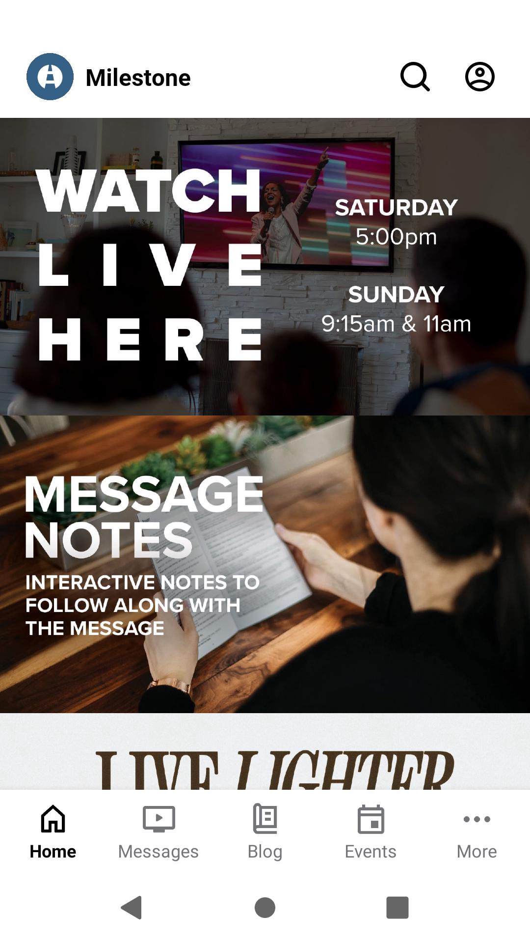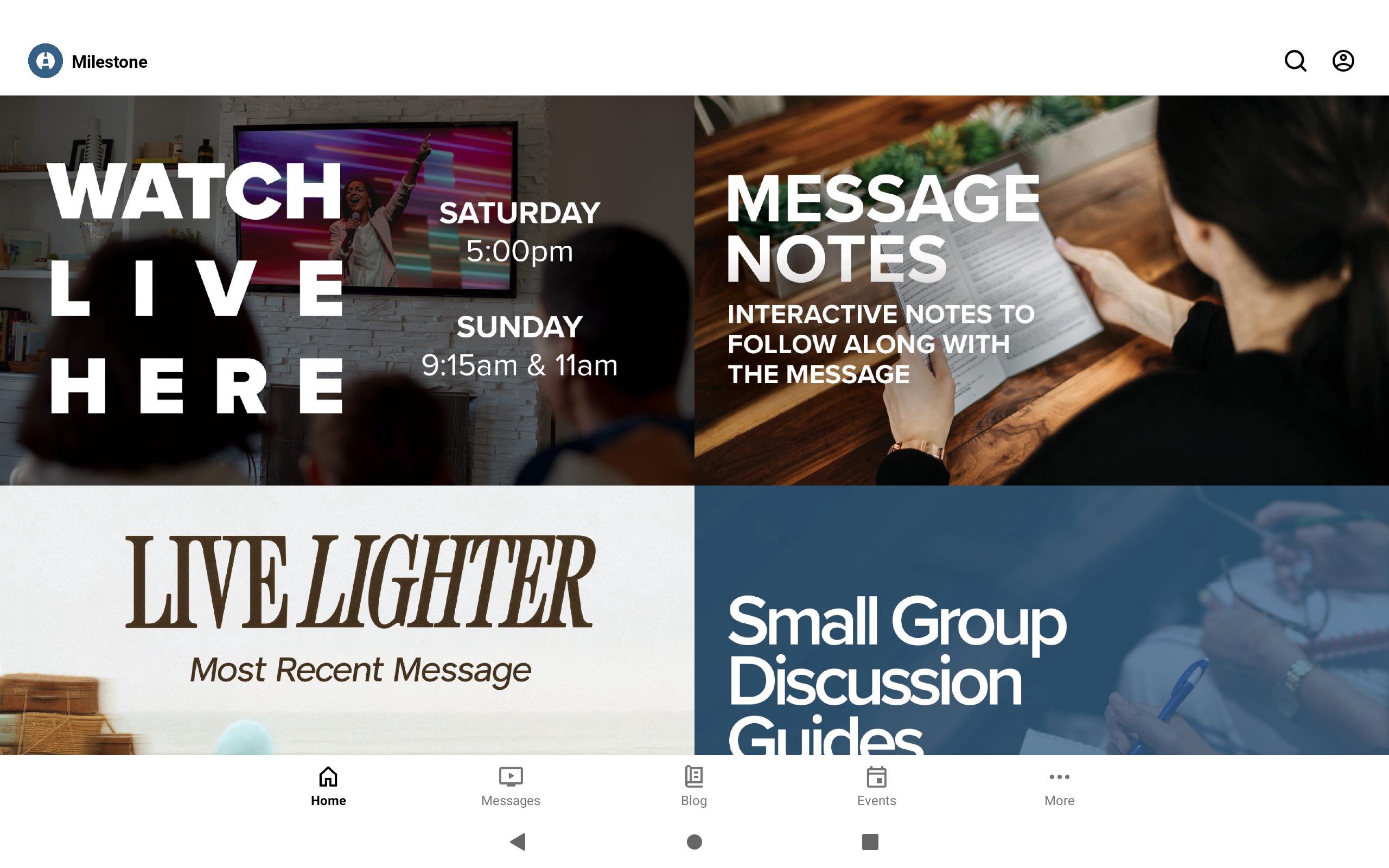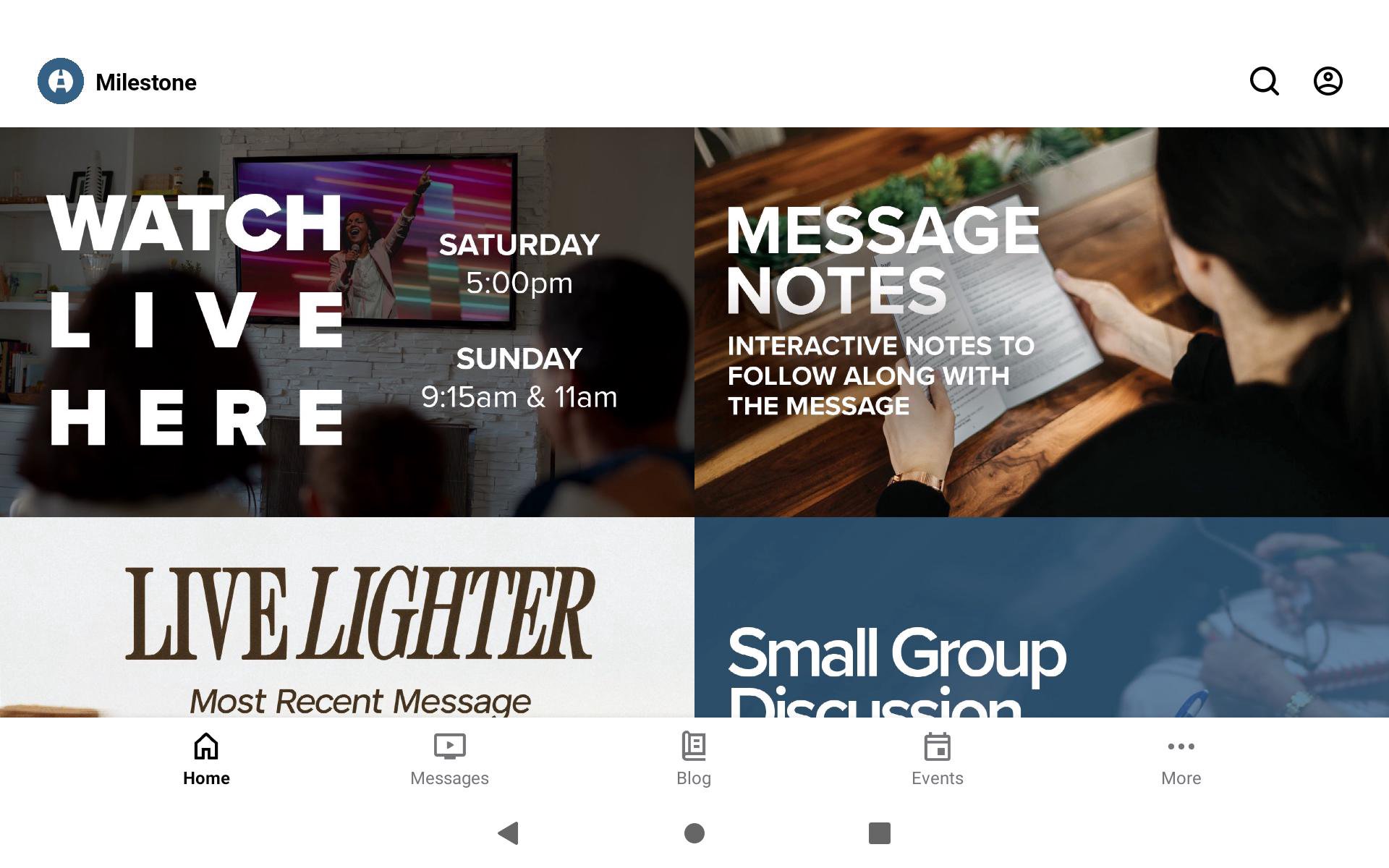 Welcome to the official Milestone Church app! This app has been created as a free, on-the-go resource. You can watch or listen to messages, connect with others in our live online services, access event information, find a Small Group, read Milestone Life stories, and much more. For more information about Milestone Church, please visit milestonechurch.com.