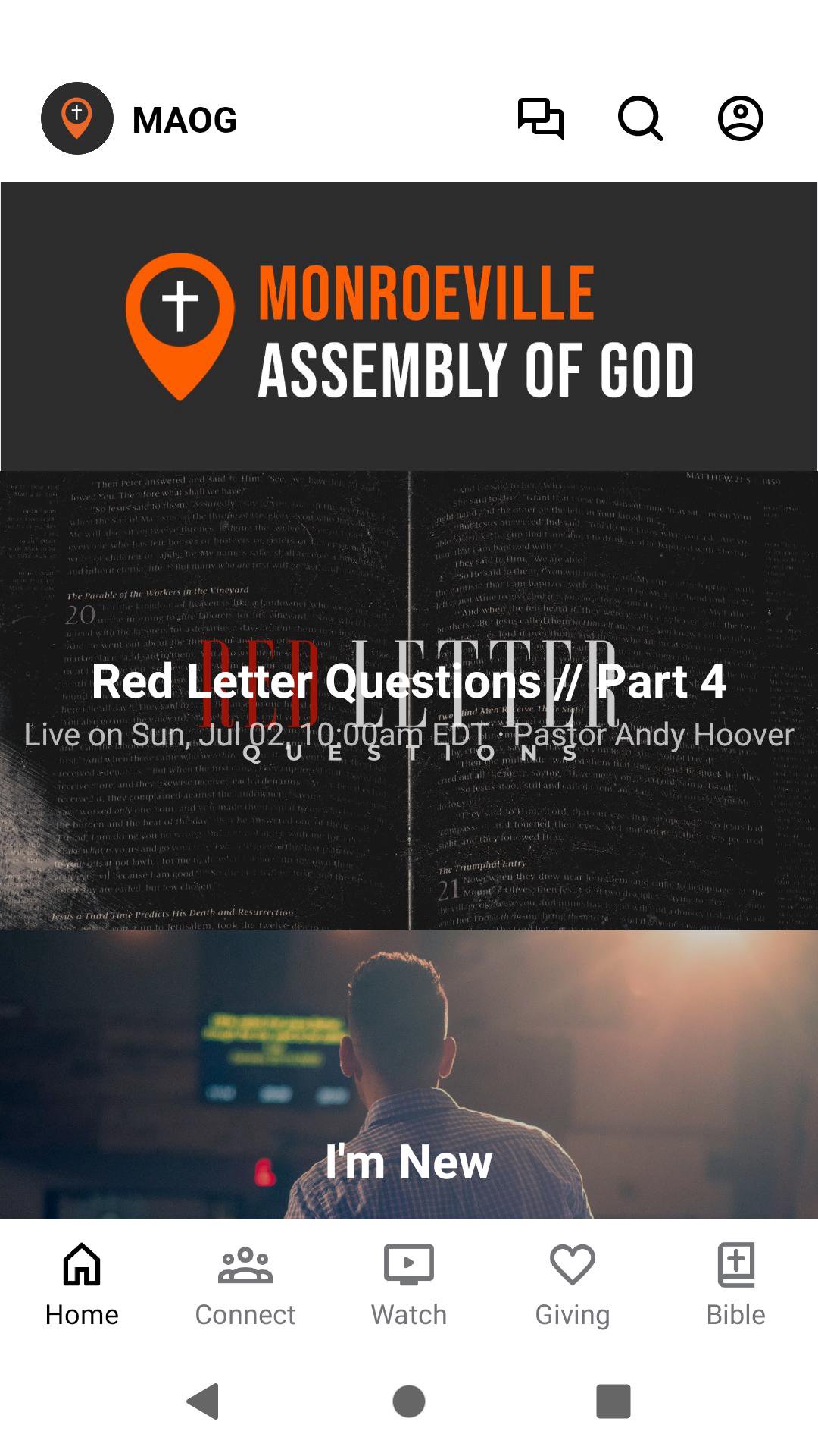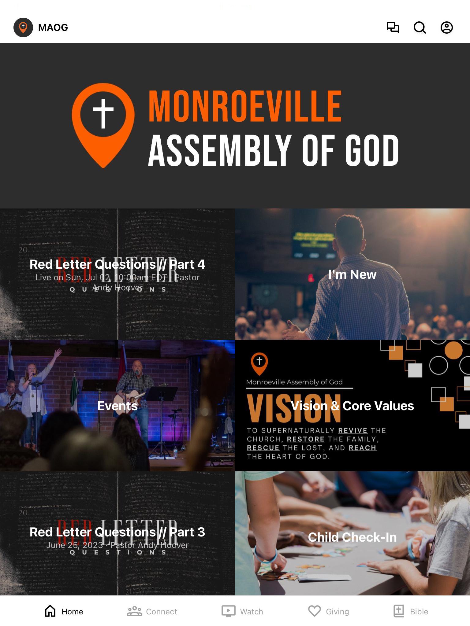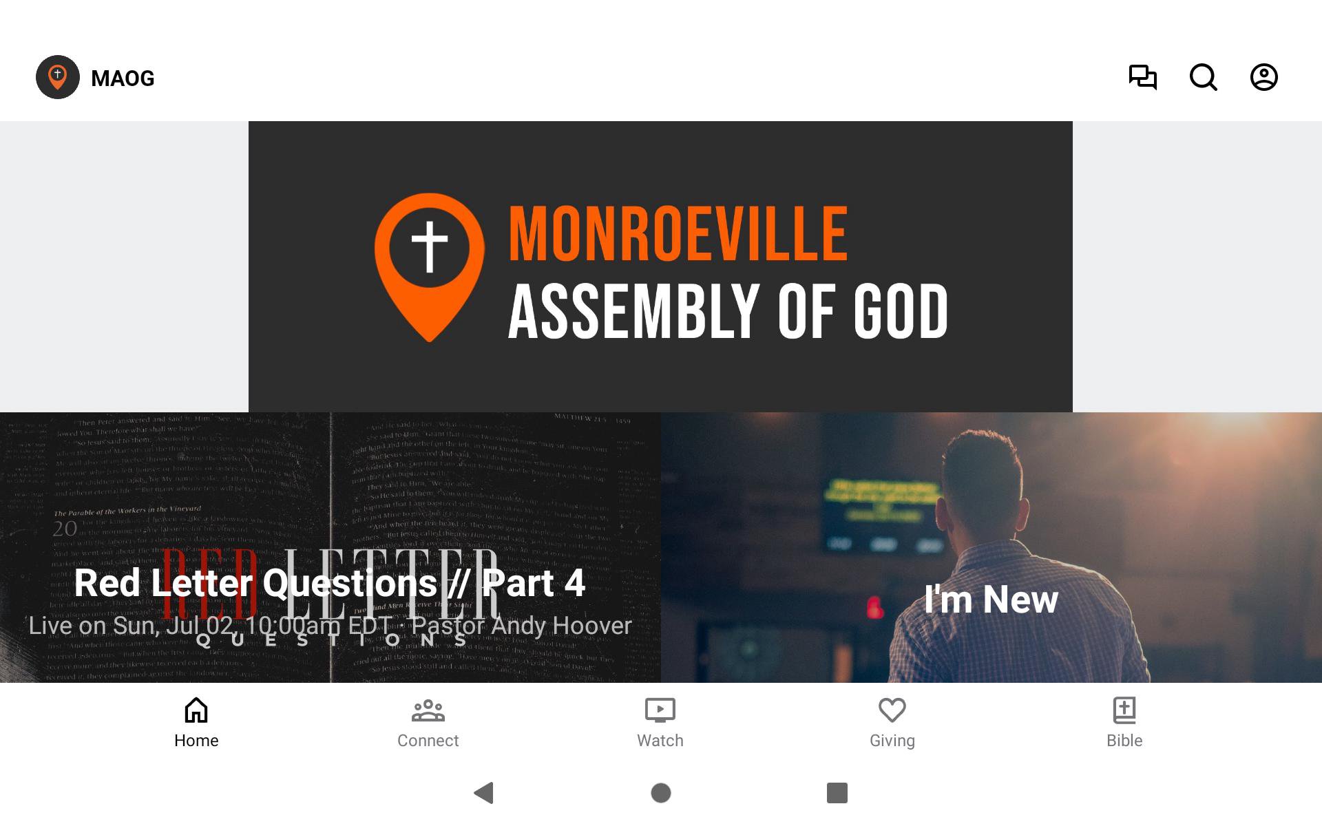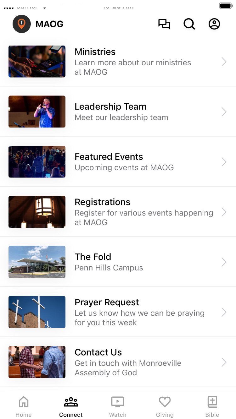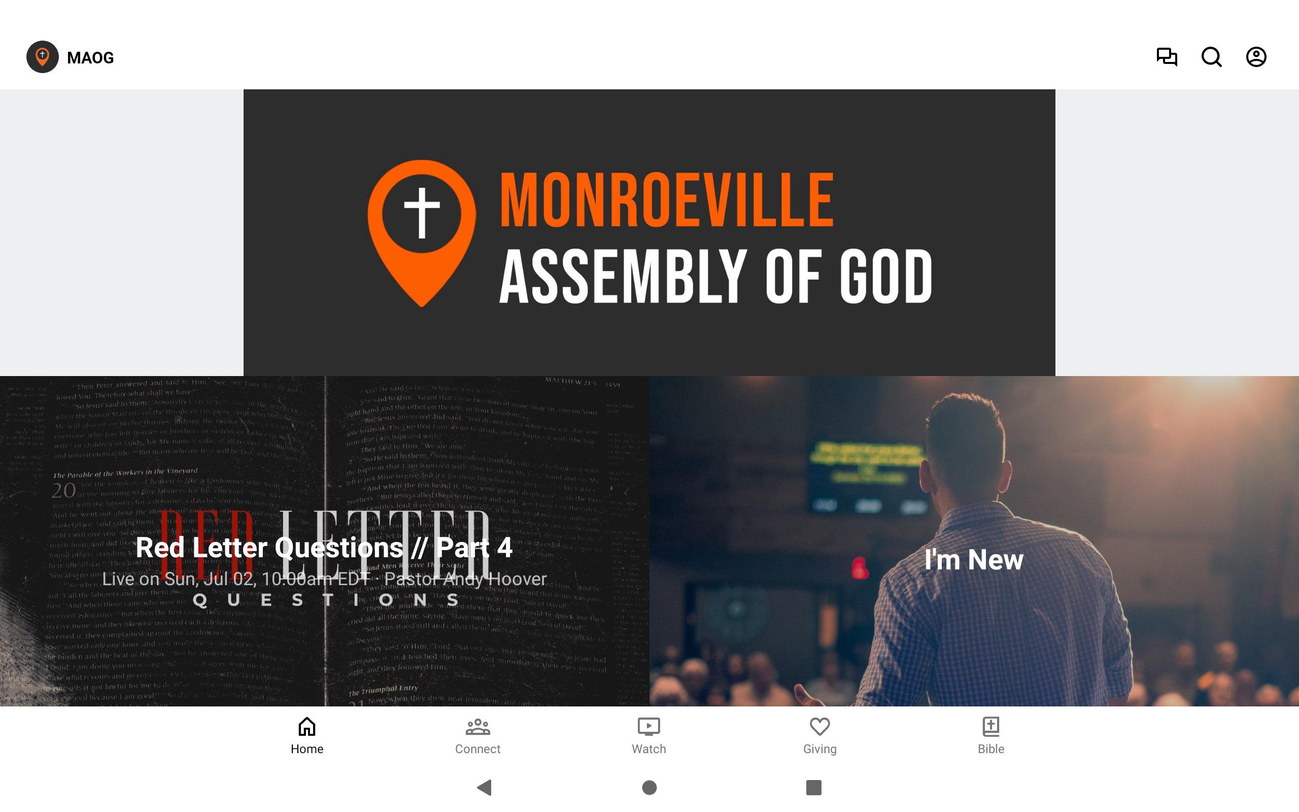 Welcome to the Monroeville Assembly of God App! With this app you can tune in to our live stream, watch or listen to past messages, stay up to date with push notifications, find out about upcoming events, contact us, and give.