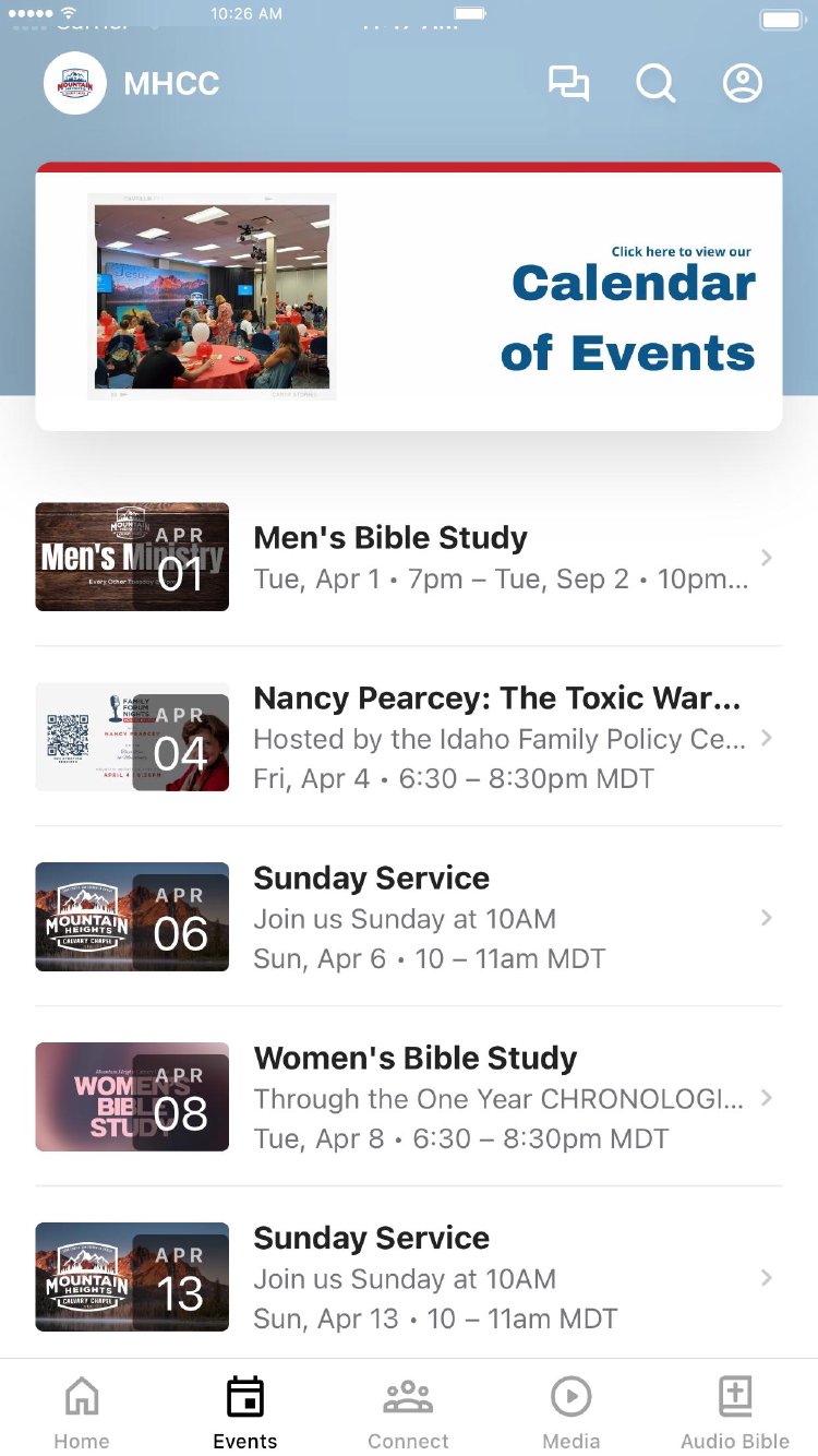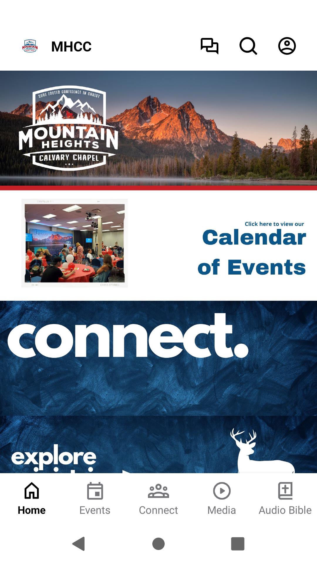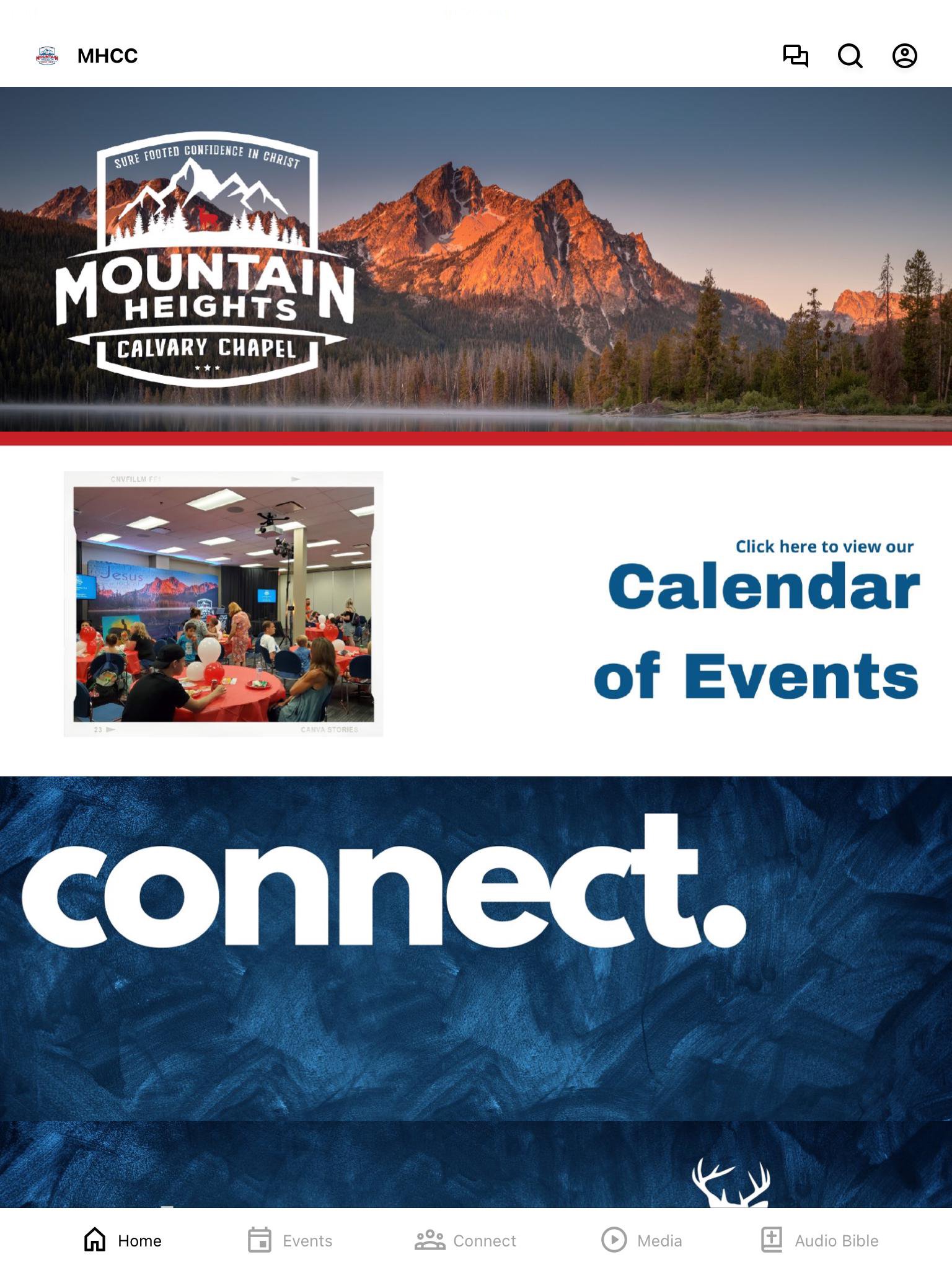 The Mountain Heights Calvary Chapel app will help you stay connected with the day-to-day life of our church. With this app you can: watch or listen to sermons; stay up-to-date with events and small groups; give to the church, take advantage of our Bible reading plan and receive notifications from the church.
