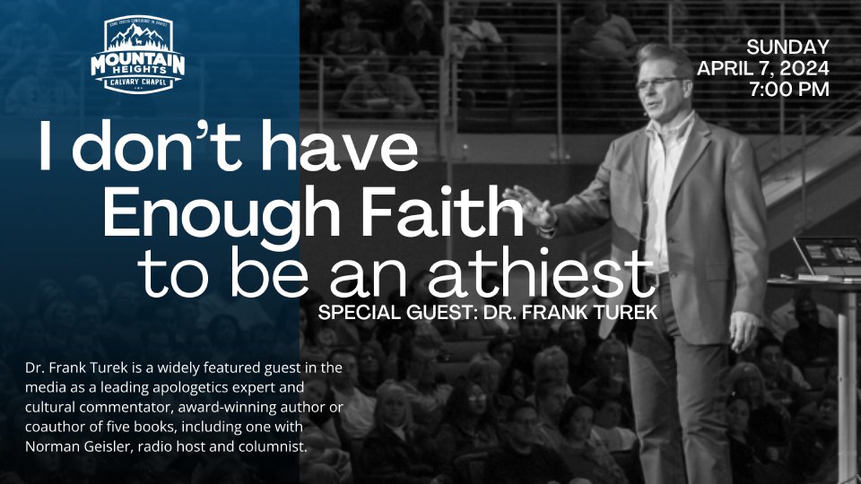 Apologist Dr. Frank Turek will join us Sunday, April 7th at 7pm for a conversation entitled, “I don’t have enough faith to be an atheist.”