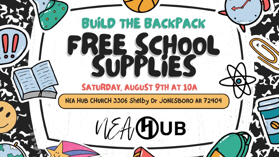 We’re equipping the next generation! Join us for Build The Backpack at The Hub a powerful community event where 1,000 backpacks filled with essential school supplies will be given away to K-12 students across Northeast Arkansas.