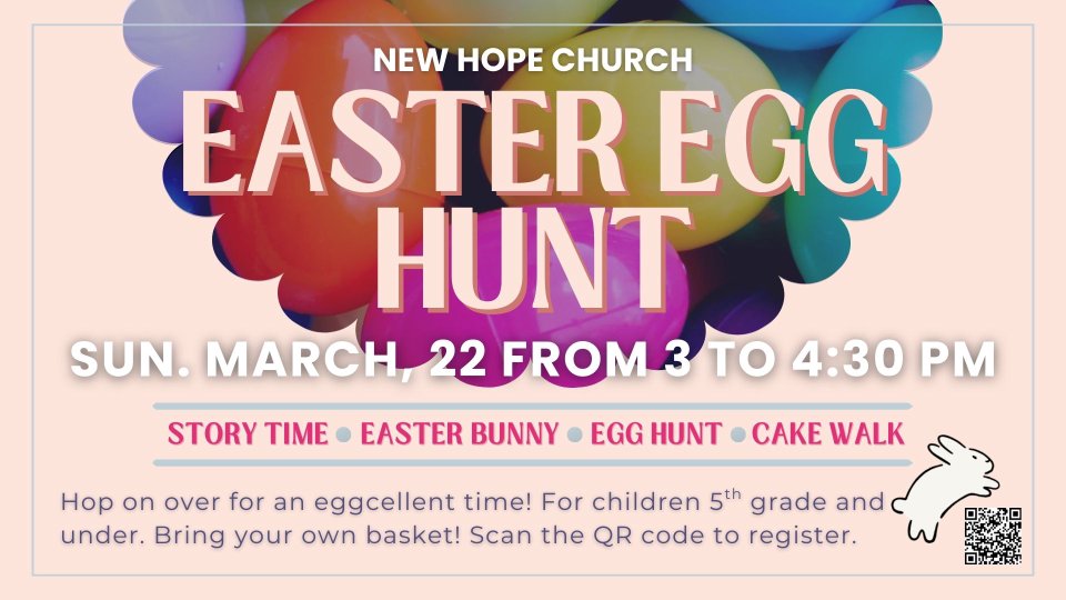 Join us at New Hope Church in POWELL, OHIO for our annual Easter Egg Hunt and Celebration on Sunday, March 22 from 3:00-4:30 pm! We'll have Story Time, Cake Walk, Easter Bunny, and Egg Hunt! Children in 5th grade and younger are welcome to participate! Please bring your own basket/bag for the hunt!