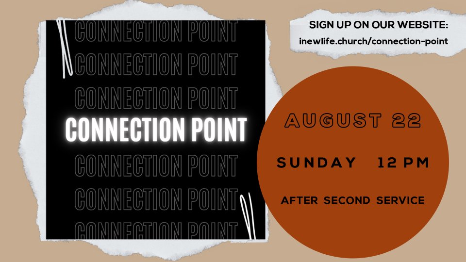 Want to get connected with our church, meet the leaders, & take the next steps into growing your faith? Sign up for Connection Point below! We will have our next meeting on Sunday, August 22nd after the second service at 12pm. We can't wait to meet you!