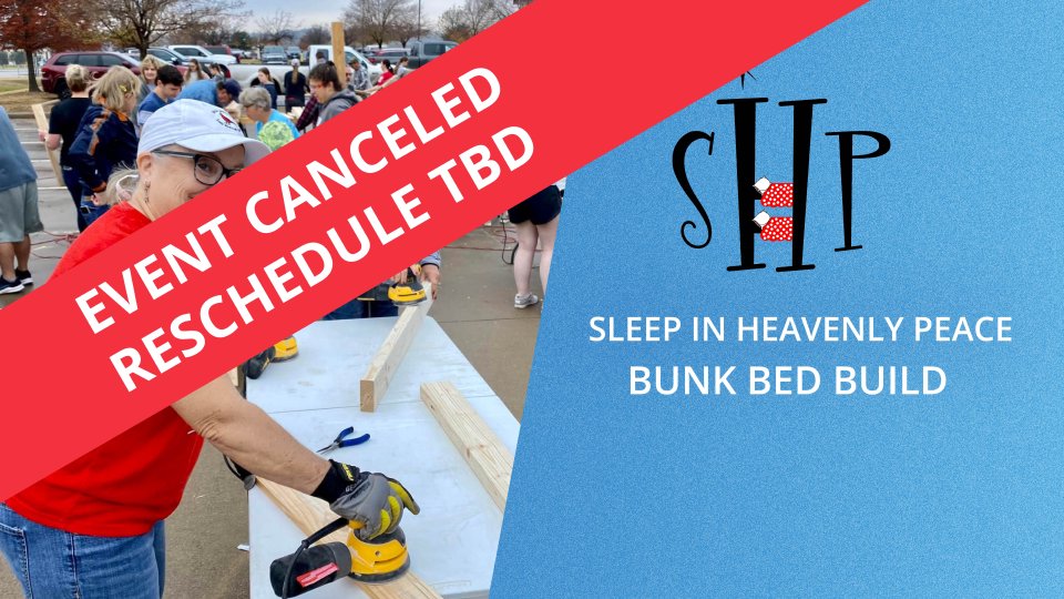 Out of an abundance of caution due to the forecasted severe thunderstorms this weekend, the Sleep in Heavenly Peace Bed Build scheduled for February 14th has been canceled. Rescheduled event is to be determined.