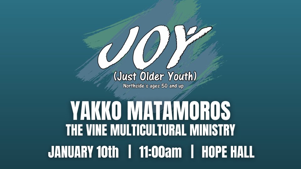 The JOY (Just Older Youth) Group Luncheon is Tuesday January 10th, 11:00am-12:30pm in Hope Hall. The speaker will be our very own Yakko Matamoros, Vine Ministry Director who will share about the Vine Ministry Activities. You may register for lunch ($7.00each) or you can brown bag your meal for free. Please register by Monday January 9th by 10am. The menu is: chicken rotel, hot rolls, braised carrots, broccoli slaw salad, and Do Nothing Cake (yummy pineapple in it)