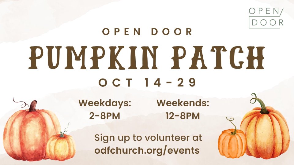 This October, Open Door is having a PUMPKIN PATCH fundraiser. All proceeds from selling these orange spheres will help kids go to camp. The Pumpkin Patch opens October 14th and ends October 29th. Its hours will be Monday-Friday from 2pm-8pm, and Saturday-Sunday from 12pm-8pm. But to make this fundraiser truly successful, we need your help! Volunteers are going to be the backbone of this autumn operation. Adults, teens,* and kiddos,* are all welcome to serve! To volunteer, please register for a volunteer time slot. If you want to help more than once, return to the registration and re-register for each time slot you desire. *Student volunteers (Kids, Jr High, and High School) will receive camp credit for each hour they serve!