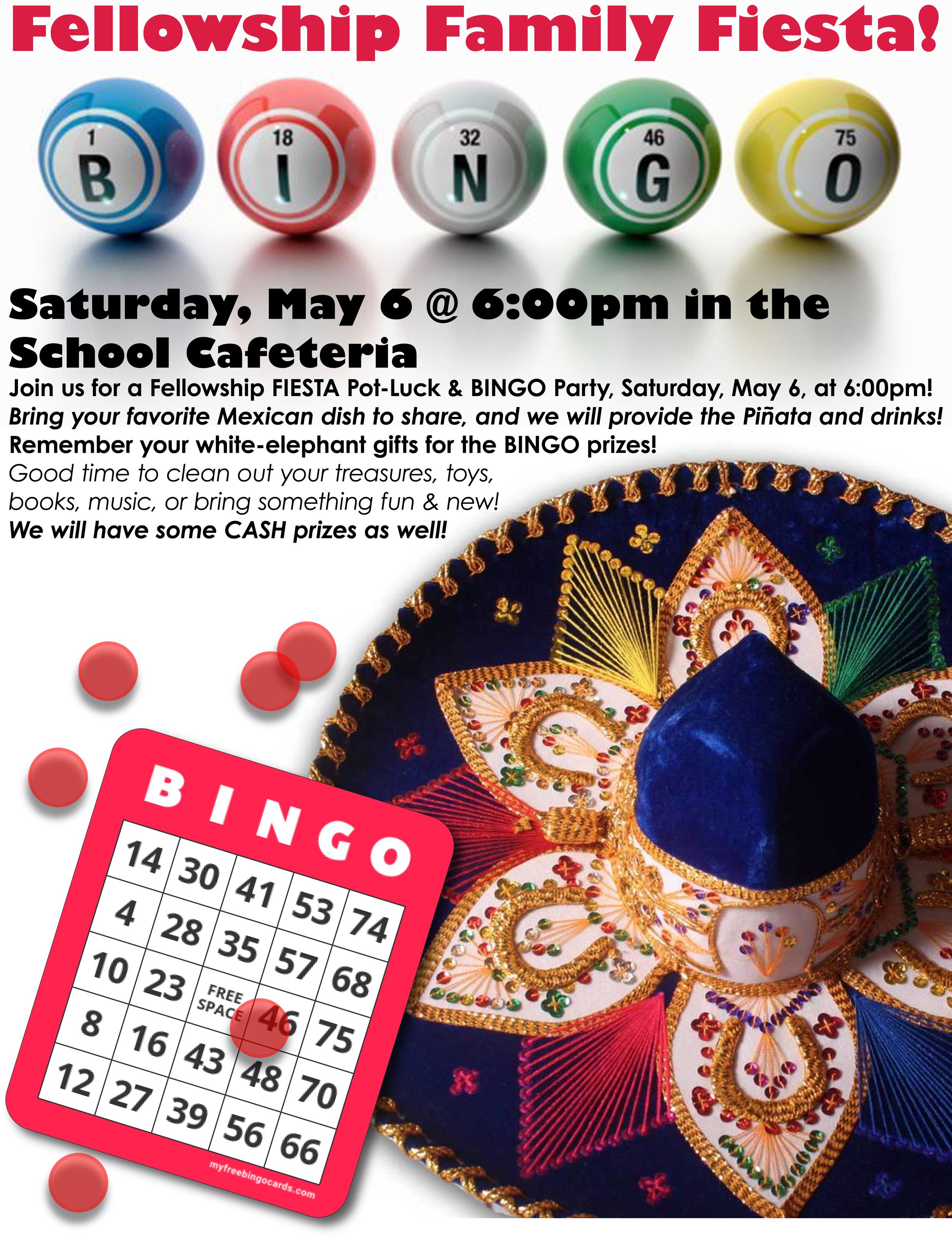 Join us for a Fellowship FIESTA Pot-Luck & BINGO Party, Saturday, May 6, at 6:00pm, in the OSL School Cafeteria. FUN for all ages! Bring your favorite Mexican dish to share, and we will provide the Piñata and drinks! Remember your white-elephant gifts for the BINGO prizes! Good time to clean out your treasures, CDs, toys & books, or bring something fun & new. We will also have some CASH prizes as well!