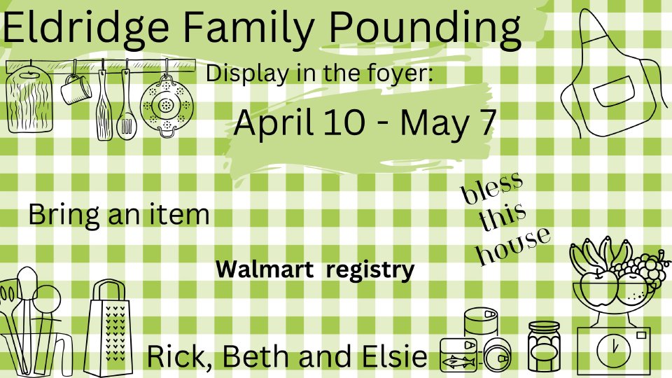Starting April 10th, going through May 7th we will have a 'pounding' for Beth Faust Eldridge. Rick and Beth (Rick and Connie's daughter) and Elsie have moved from Hawaai to Siloam. Let's welcome and bless them by supplying some much needed items to make their house a home. Beth is registered at Wal-Mart. Just bring your purchased item(s) and add to the display in the church foyer.