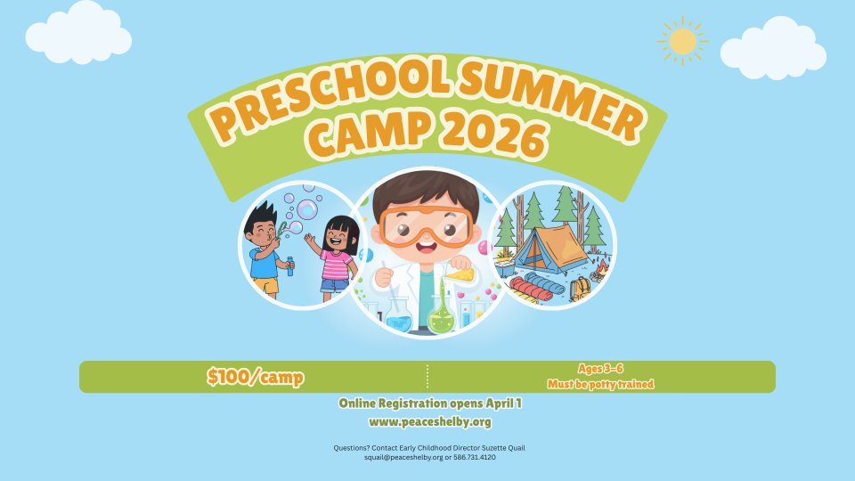 Camps run Monday-Thursday from 9:00 am-12 pm. (Children must be potty-trained). Children will bring their own water bottle and healthy snack (NUT FREE) for each day of camp. Campers may be photographed and photos shared on media outlets. If you do not wish for your child's photo to be used, please email squail@peaceshelby.org