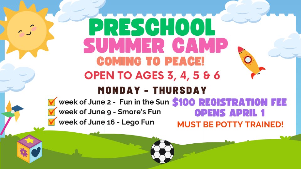 Camps run Monday-Thursday from 9:00am-12pm. (Children must be potty-trained). Children will bring their own water bottle and healthy snack (NUT FREE) for each day of camp. Campers may be photographed and photos shared on media outlets. If you do not wish for your child's photo to be used please email squail@peaceshelby.org