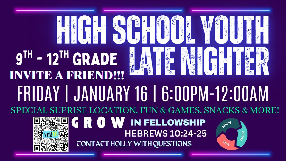 Join us at this year's High School Youth Late-Nighter. God created us for connection and accountability. We need each other. This year we are focusing on "Grow"ing in our relationships with each other and God.