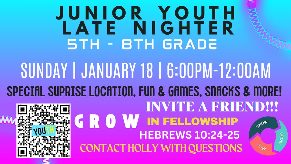 Join us at this year's Junior Youth Late-Nighter. God created us for connection and accountability. We need each other. This year we are focusing on "Grow"ing in our relationships with each other and God.