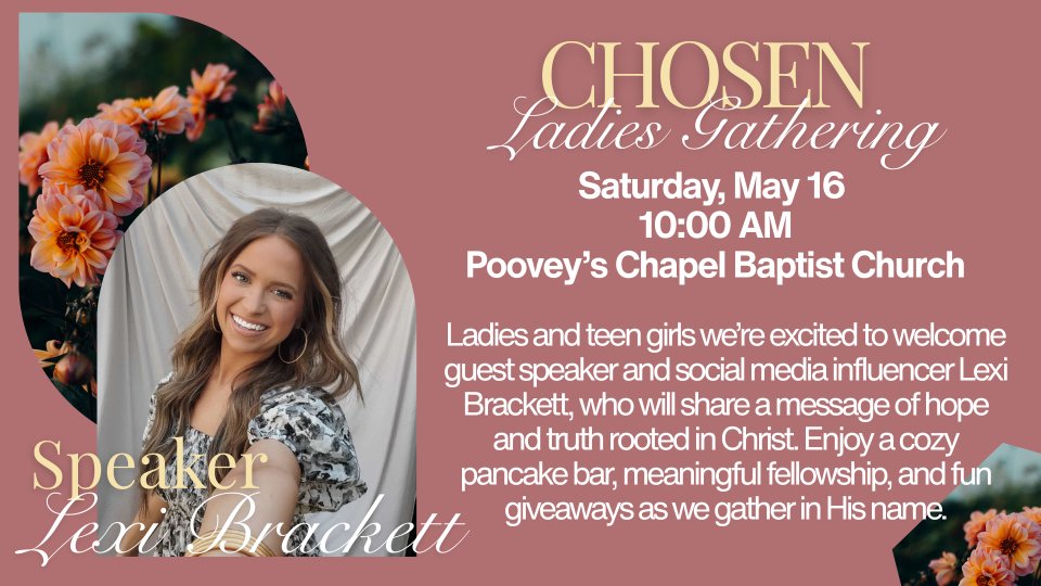 You’re warmly invited to a Chosen Ladies Gathering at Poovey's Chapel Baptist Church—a special time centered on growing closer to Jesus and encouraging one another in faith. Join us as we worship, connect, and reflect on God’s goodness together.