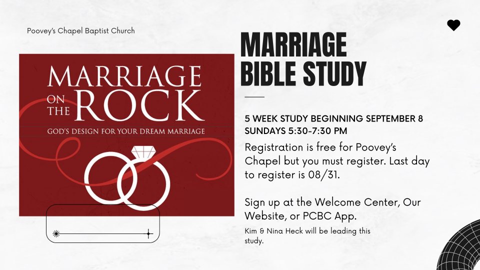 This Bible study is free for anyone who attends Poovey's Chapel Baptist Church. If you would like to be a part of this bible study and do not attend PCBC the cost is just $14.00 per couple this is to cover the cost of materials. Kim and Nina Heck will be leading this study. They are also available for private issues that might come up.