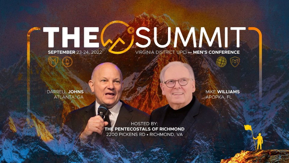 Virginia District UPCI's annual conference designed to minister to the great men of Virginia. Fathers are encouraged to bring their sons. "THE SUMMIT" conference is recommended for young men ages 12 and up. SERVICE TIMES: Friday, September 23 at 7:30 PM Saturday, September 24 at 9:00 AM SPEAKERS: Mike Williams - Bishop of The Pentecostals of Apopka - Apopka, FL Darrell Johns - Pastor of Atlanta West Pentecostal Church - Lithia Springs, GA REGISTRATION: Pre-Registration (Until 9/22) - $35 At the Door - $40 ($25 Friday PM Session, $15 Saturday AM Session) *** Pork BBQ Dinner Following Friday Service (Included in Registration) ***