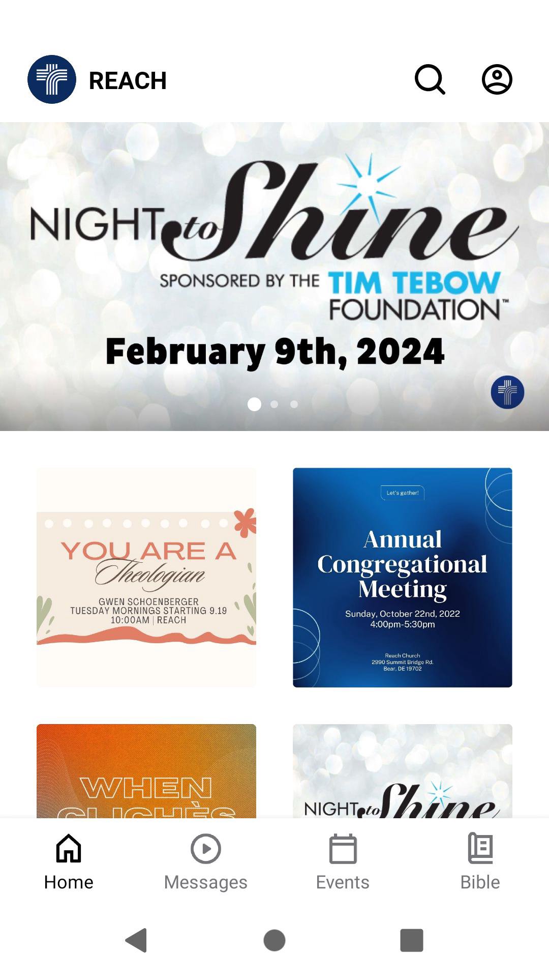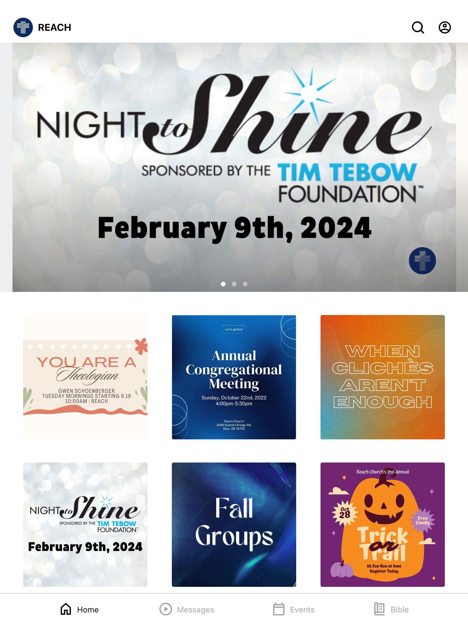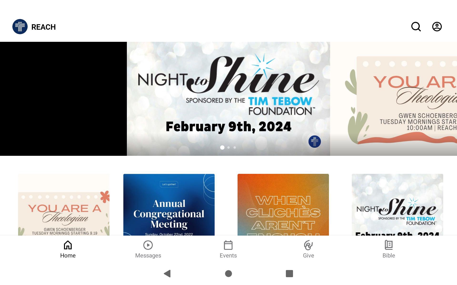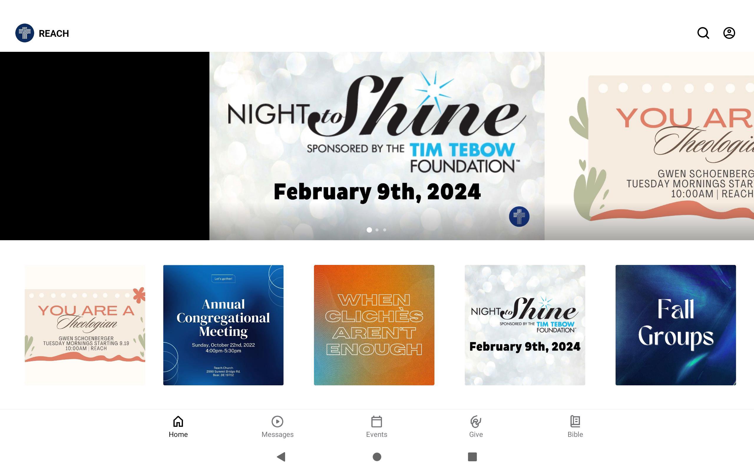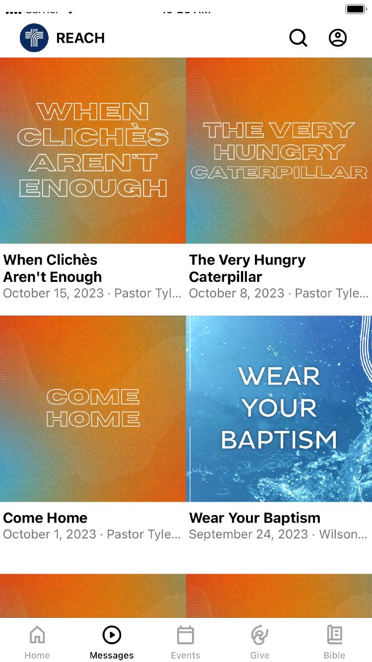The Reach Church app will help you stay connected with the day-to-day life of our church. With this app you can: - Watch or listen to past messages - Stay up to date with push notifications - Share your favorite messages via Twitter, Facebook, or email - Download messages for offline listening