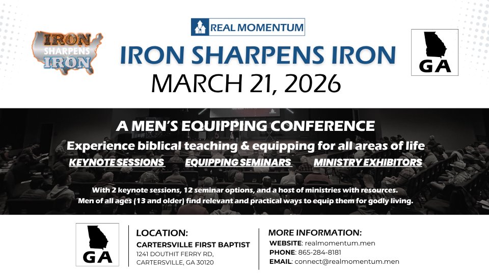REAL MOMENTUM's IRON SHARPENS IRON Conference is the ultimate event to sharpen men for Kingdom impact. With Keynote messages from Stephen Kendrick, Keith Boggs, and Scott Sullivan, as well as 16 different men's equipping seminars - and lunch - plus resources!