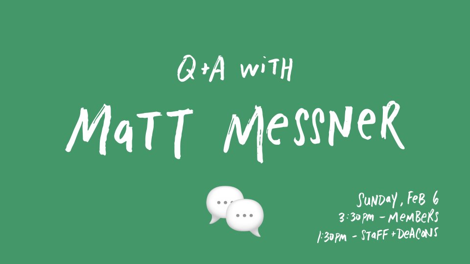 Matt Messner is not able, at this time, to discuss this possible transition with his current employer. It is extremely important that this possible transition is not discussed outside the church. All members are invited to a Special Q&A with Proposed Candidate for Pastor of Teaching & Vision, Matt Messner on Sunday, February 6th. 1:30pm with Deacons & Staff 3:30pm with all Members