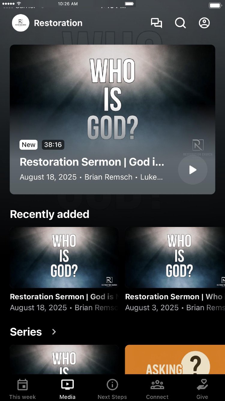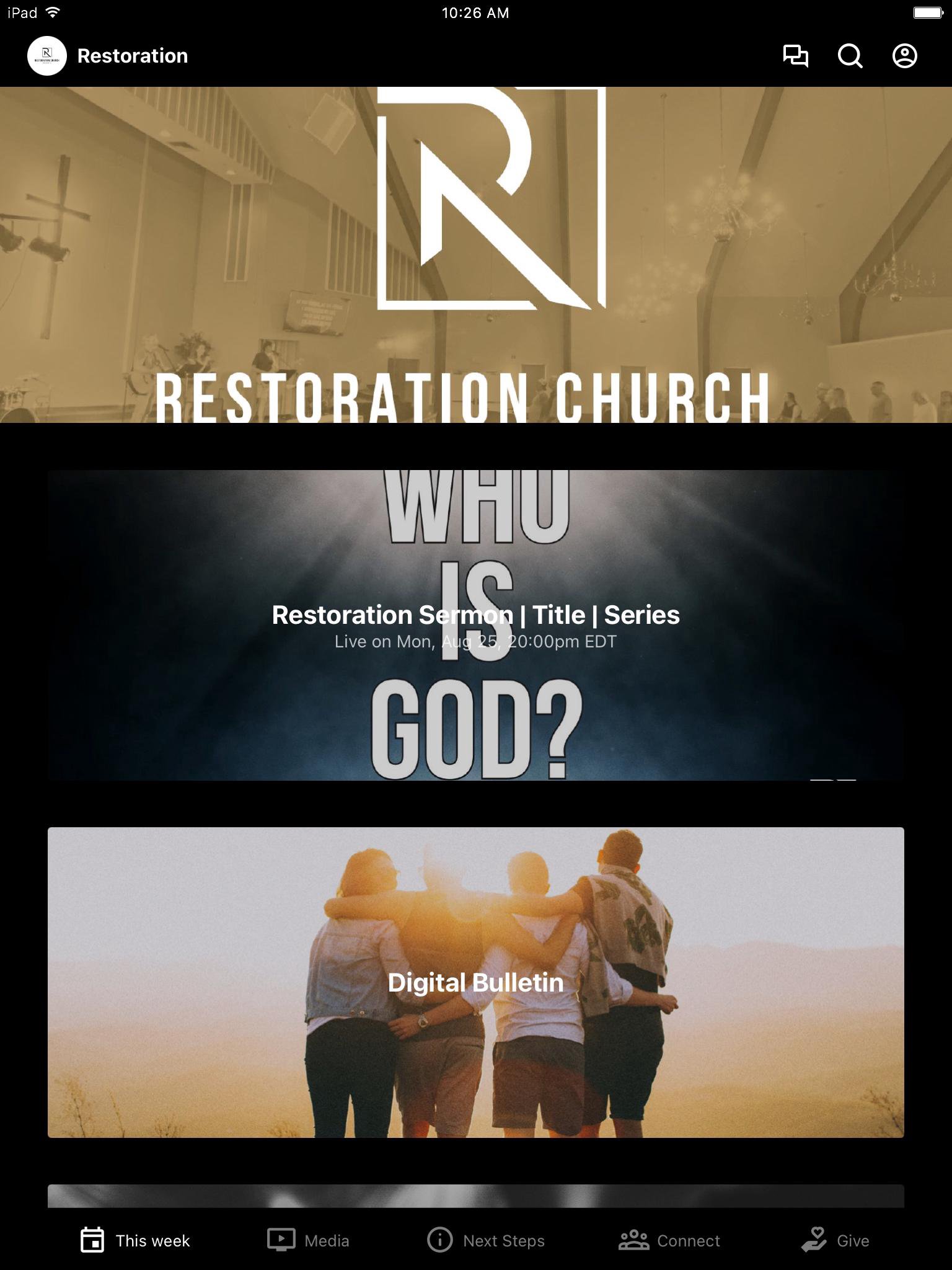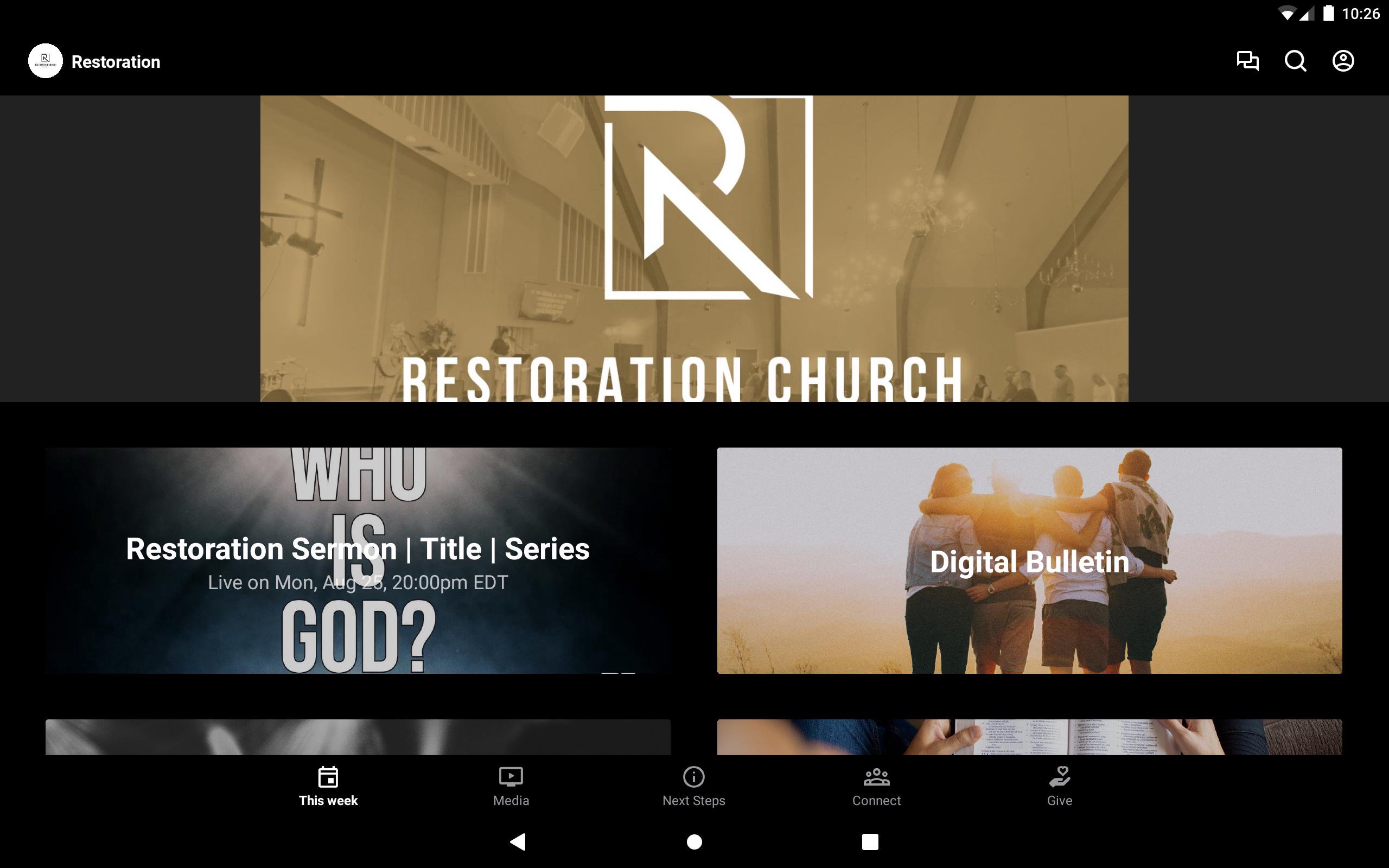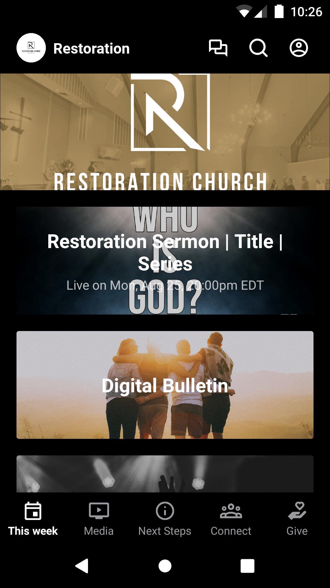 This app will help you stay connected with the day-to-day life of our Restoration Church. With this app you can: stay up to date with push notifications; connect on socials; register for events; and so much more!
