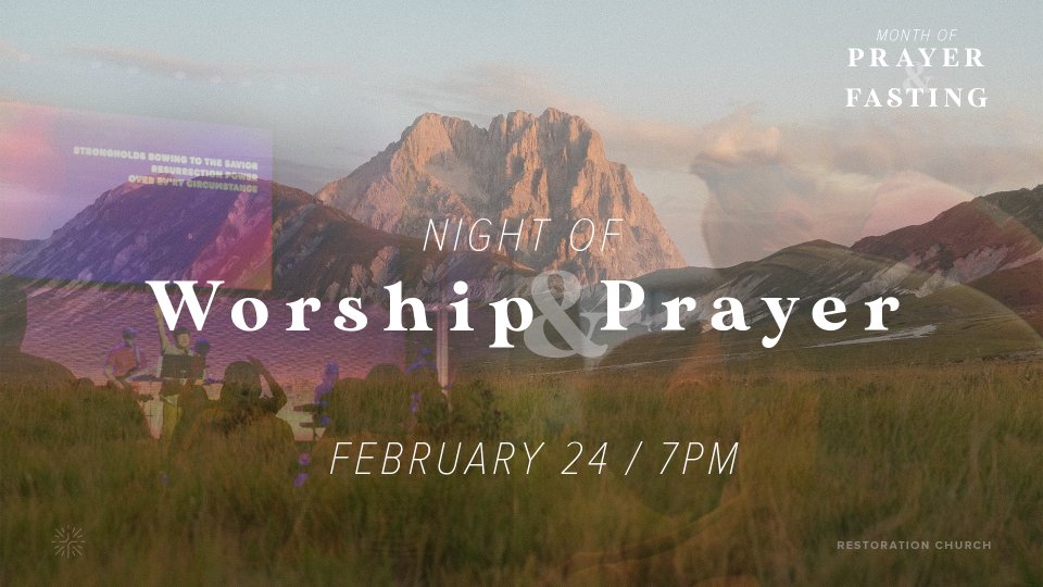At Restoration Church, we are dedicating the month of February to pray and fast together. The hope is that God would grant us greater dependence upon Him and greater unity with one another as we draw near to Him in prayer. We are looking forward to spending an evening together to take intentional time to sing together and prayer with and for one another. Kids Care available from birth-5 years on a first come, first served basis.