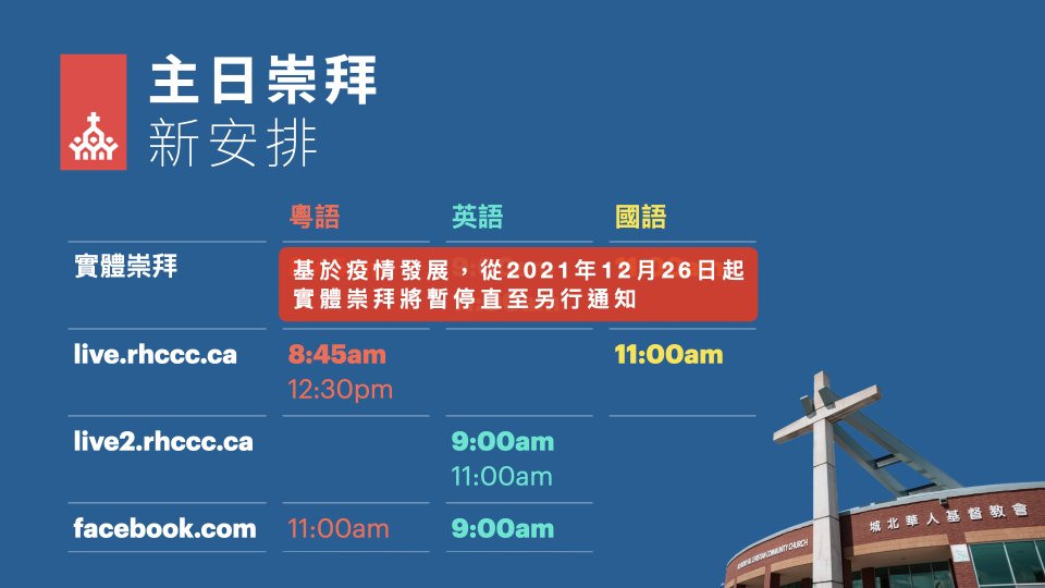 基於疫情發展,從2021年12月26日起直至另行通告,主日崇拜將只在網上舉行,詳情如下: 粵語網上崇拜|live.rhccc.ca 主日 8:45 AM-10:00 AM 主日 12:30 PM-1:45 PM 粵語網上崇拜|Facebook.com/rhccc 主日 11:00 AM – 12:15 PM 國語網上崇拜|live.rhccc.ca 主日 11:00 AM – 12:15 PM 英語網上崇拜|live2.rhccc.ca 主日 9:00 AM-10:15 AM 主日 11:00 AM-12:15 PM 英語網上崇拜|Facebook.com/rhccc 主日 9:00 AM-10:15 AM 如果您有任何問題,歡迎通過 mailbox@rhccc.ca 和 905-884-3399 聯絡我們。謝謝,願神保守大家。