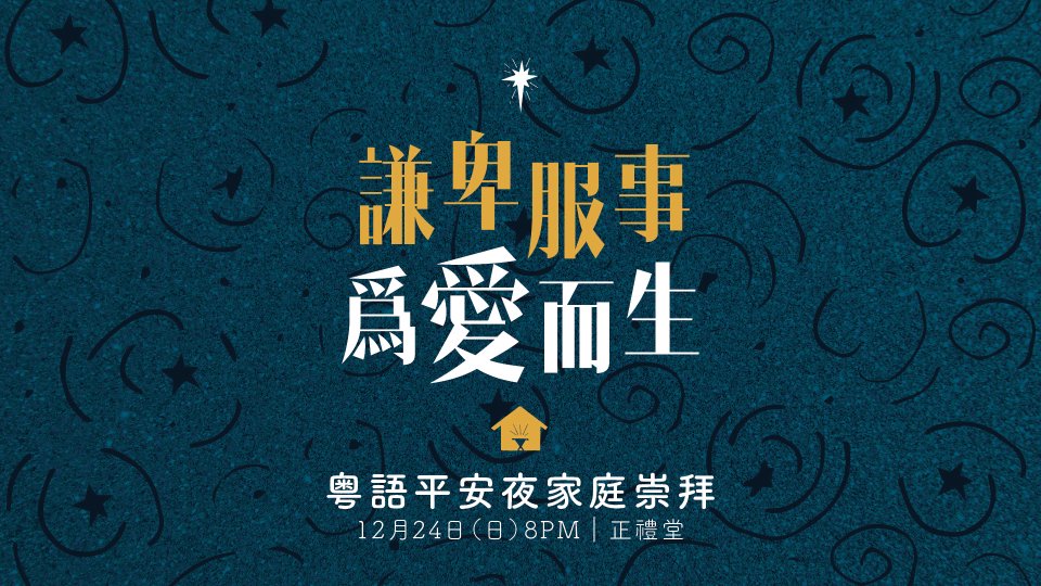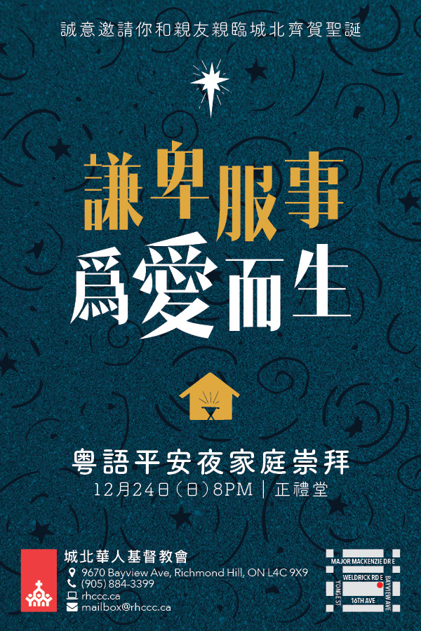 鼓勵邀請家人及親友參加教會聖誕崇拜聚會。 可向詢問處索取聖誕聚會邀請咭,邀請親友參加各堂聖誕聚會: 國語聖誕日:12月24日(日)11:00AM 英語聖誕日:12月25日(一)10:00AM
