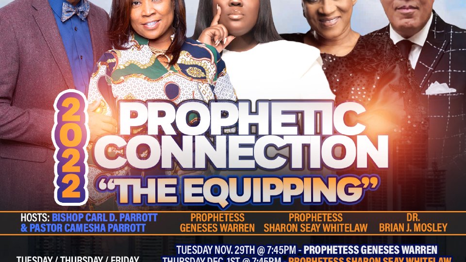 We're excited about this year's Prophetic Connection conference. Registration is required for in-person service. There is no cost to attend. Our outline is as follows: * Please Note: There is NO service on Wednesday* Tuesday, November 29th - @ 7:45PM Prophetess Geneses Warren Thursday, December 1st - @ 7:45PM Prophetess Sharon Seay Whitelaw Friday, December 2nd - @ 7:45PM Dr. Brian J. Mosley Saturday, December 3rd - @ 11AM Morning Glory Sunday, December 4th @ 11:30AM Dr. Brian J. Mosley