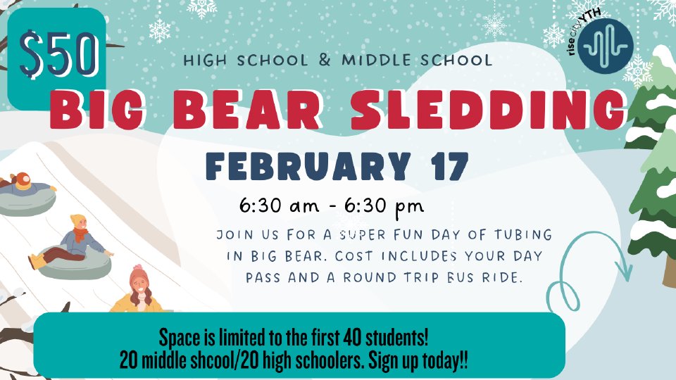 Middle Schoolers AND High Schoolers! Join us for a super fun day of tubing in Big Bear on February 17th! We will leave the church at 6:30am and get back around 4:30pm. Cost is $50 and includes your day pass and round trip bus ride. We have 20 middle school and 20 high school spots. Please make sure you are signing up your student(s) in the correct section. There is waiver that must be signed before the trip; you can fill it out here by copying and pasting this link: https://alpineslidebigbear.com/wp-content/uploads/2023/11/Alpine-Slide-Release-Waiver-2023.pdf What to Bring: Snacks $ for lunch or a packed lunch Extra pair socks Water bottle What to wear: Layers, layers, layers Snow clothes Snow or hiking boots What to expect: A fun filled day of snow tubing with the RCY crew!