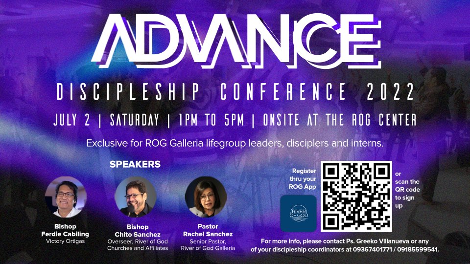 Leaders, together let's ADVANCE the kingdom!!! Expect a powerful outpouring of the Holy Spirit in “ADVANCE: Disciple Conference 2022.” This gathering is exclusive for ROG Lifegroup leaders, disciplers and interns. Let's come together on July 2, Saturday from 1PM to 5PM, onsite at ROG Center. With our speakers, Bishop Chito Sanchez, Pastora Rachel Sanchez, and Bishop Ferdie Cabiling of Victory Ortigas. We are so fired up to equip you, so don't miss this! We'll see you there! You may scan the QR code on the photo to register, or click the link above.