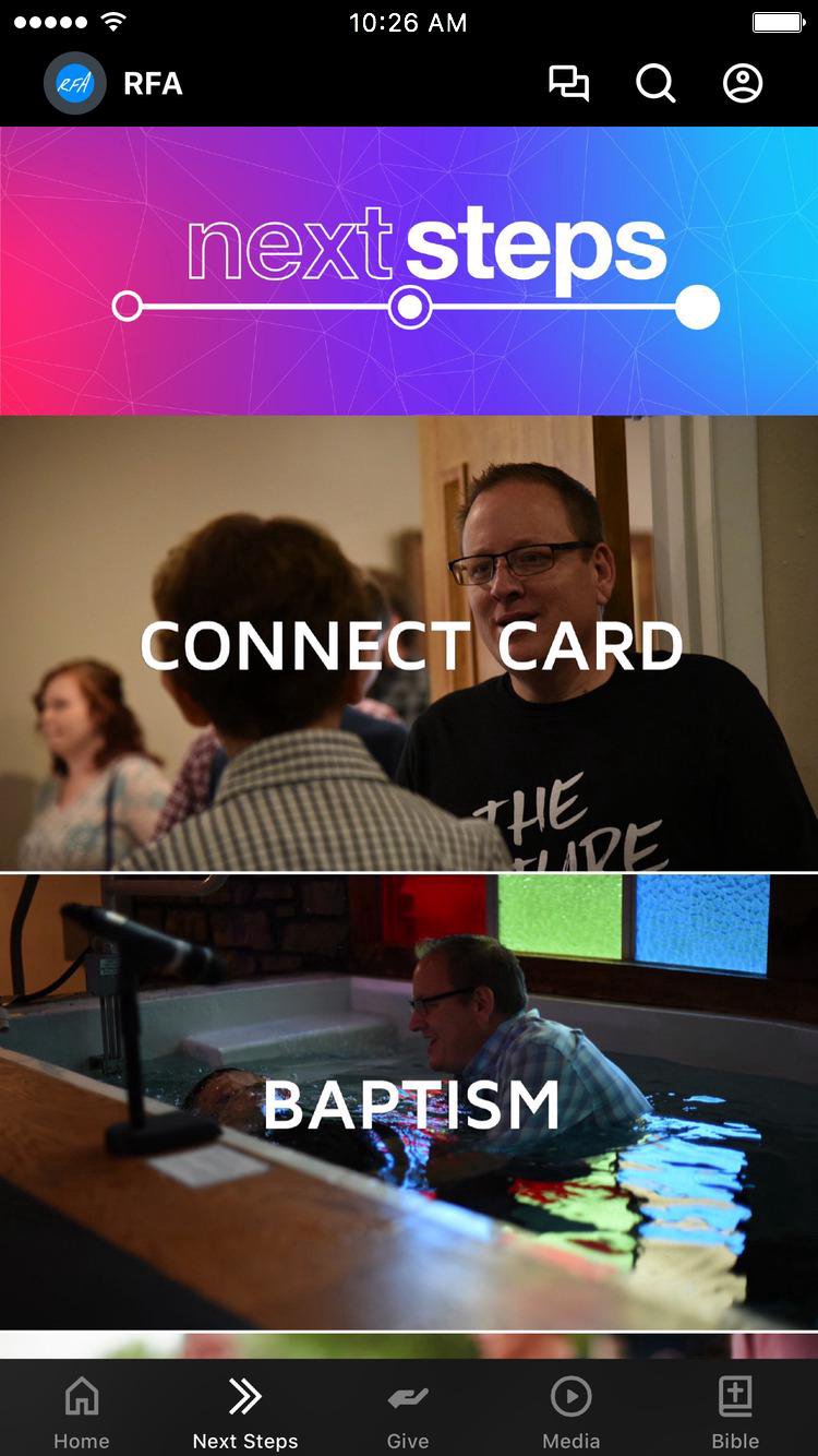 This app will help you stay connected with the day-to-day life of RFA. With this app you can: watch our weekly live stream; watch or listen to past messages; stay up to date with push notifications; see our upcoming events; share your favorite messages via Twitter, Facebook, or email; and download messages for offline listening.