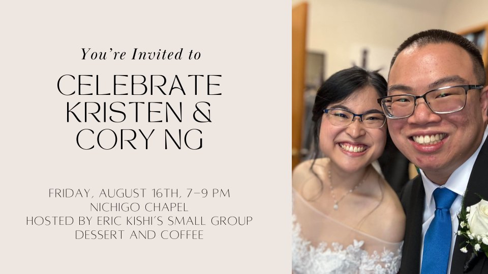 Friday, August 16th, from 7 to 9 pm Eric Kishi’s small group will be hosting a dessert and coffee event to celebrate Kristen and Cory Ng’s marriage in the Nichigo chapel. All are invited! Dress is casual. If you have questions you can email Lynne Kishi at lynnekishi@gmail.com.