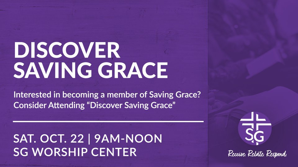 If your are interested in becoming a member or want to learn more about Saving Grace you are encouraged to attend “Discover Saving Grace” on October 22nd from 9am - Noon in the Worship Center, lunch will be provided. Please email the office using the link given if you plan to attend.