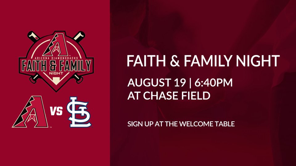 Join the D-backs and Saving Grace for Faith & Family Night! The D-backs are playing the St.Louis Cardinals on Friday, August 19th at 6:40pm. $20 per ticket. Sign up at the Welcome Table on Sunday to attend.