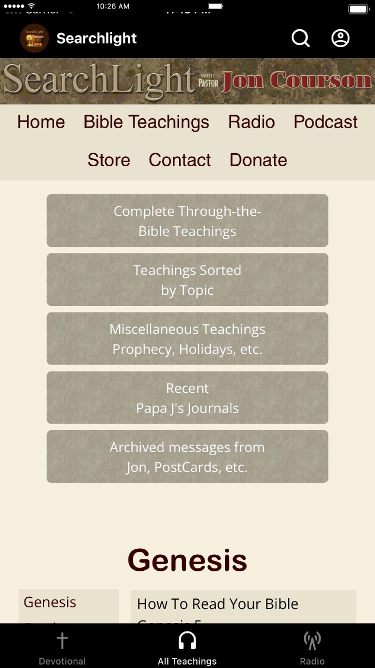 Welcome to the Searchlight with Jon Courson app With this app, you can read Pastor Jon Courson’s daily devotional, get video or audio of any of his Thru-the-Bible teachings or listen to the daily Searchlight radio program. For more information about Searchlight, please visit: www.joncourson.com The Searchlight with Jon Courson App was created with the Subsplash App Platform.