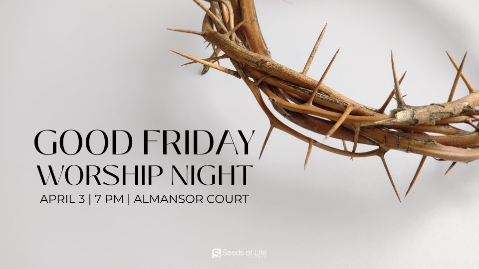 Join us on Good Friday at 7PM at Almansor Court. It will be a night of worship as we praise Jesus for His sacrifice upon the cross for our sins.
