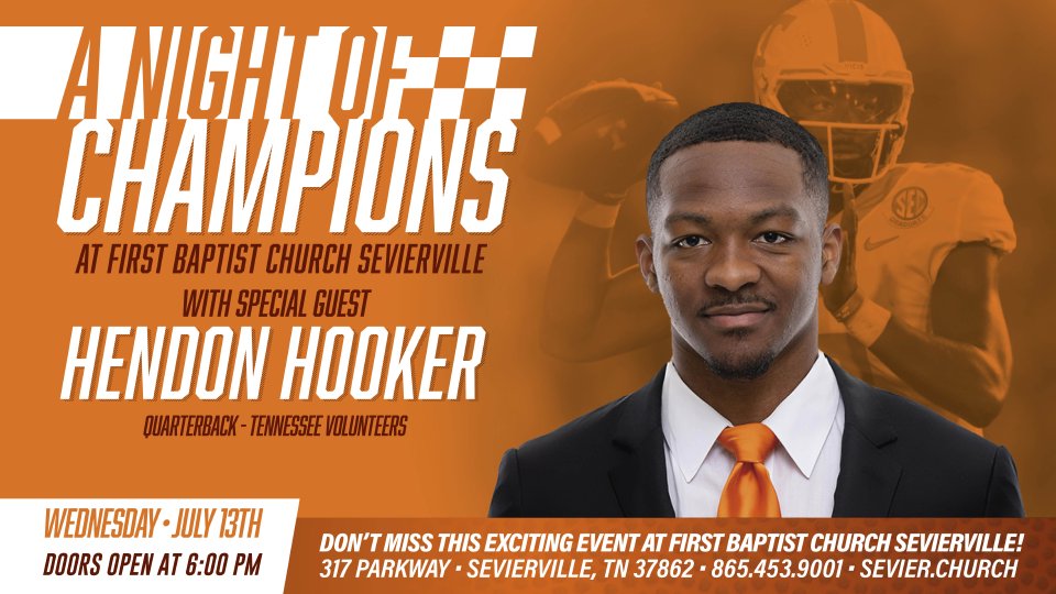 Join us on Wednesday, July 13th for a conversation with University of Tennessee quarterback Hendon Hooker about football and faith. Doors open at 6:00pm and the event starts at 6:30! A 2022 National Player of the Year candidate who is one of the top returning quarterbacks in the nation … Dynamic dual-threat graduate transfer who joined the Vols in January 2021 … Earned his undergraduate degree in public relations at Virginia Tech and spent four seasons with the Hokies prior to transferring to Knoxville … Elected to return for his sixth and final collegiate season and second season at UT … At age 24, is one of the leaders on the team … Played in 38 games with 26 career starts … Was 8-7 as a starter at Virginia Tech, completing 197-of-312 passes for 2,894 yards and 22 touchdowns through the air, while rushing for 1,033 yards on 247 carries and 15 touchdowns on the ground … Owns a 6-5 record as a starter at Tennessee with the offense averaging 39.9 points per game and 483.5 yards per game in those 11 contests … For his entire collegiate career, has put up 7,492 yards of total offense, completing 403-of-615 passes (65.5 percent) for 5,839 yards and 53 touchdowns with 10 interceptions ... Added 1,653 yards on 414 carries with 20 scores on the ground, including three 100-yard rushing games … Owns three 300-yard passing games, including two at UT … Carries a streak of 12 consecutive games with a touchdown pass into 2022, which is the third-longest streak in school history … Has produced 11 games with at least one rushing touchdown and one passing score, including five at UT … Comes from a family pedigree of quarterbacks, including his father and brother. Says his father is his biggest inspiration because he put the ball in his hand at a young age and taught him the value of hard work … Started playing football at the age of four at the local YMCA … Favorite movie is “He Got Game” … Favorite TV show is “Martin” … Co-wrote faith-based children’s scripture book called “The ABCs of Scripture for Athletes” with his brother that debuted during the 2021 holiday season … Always wanted to be like his dad and followed the career of NFL star and fellow Greensboro native Keenan Allen … Twitter handle is @henhook2 and Instagram handle is @henhook_112.