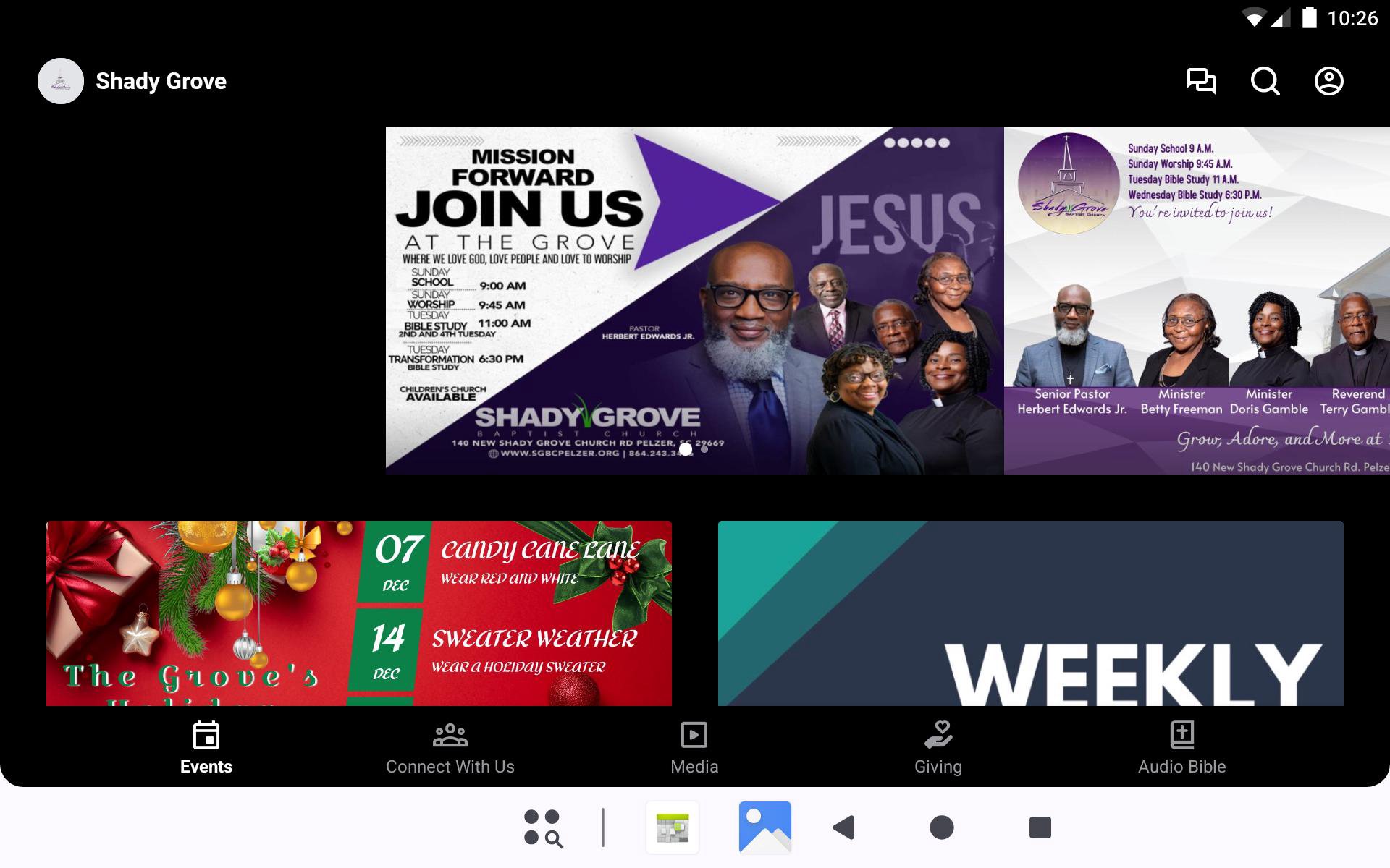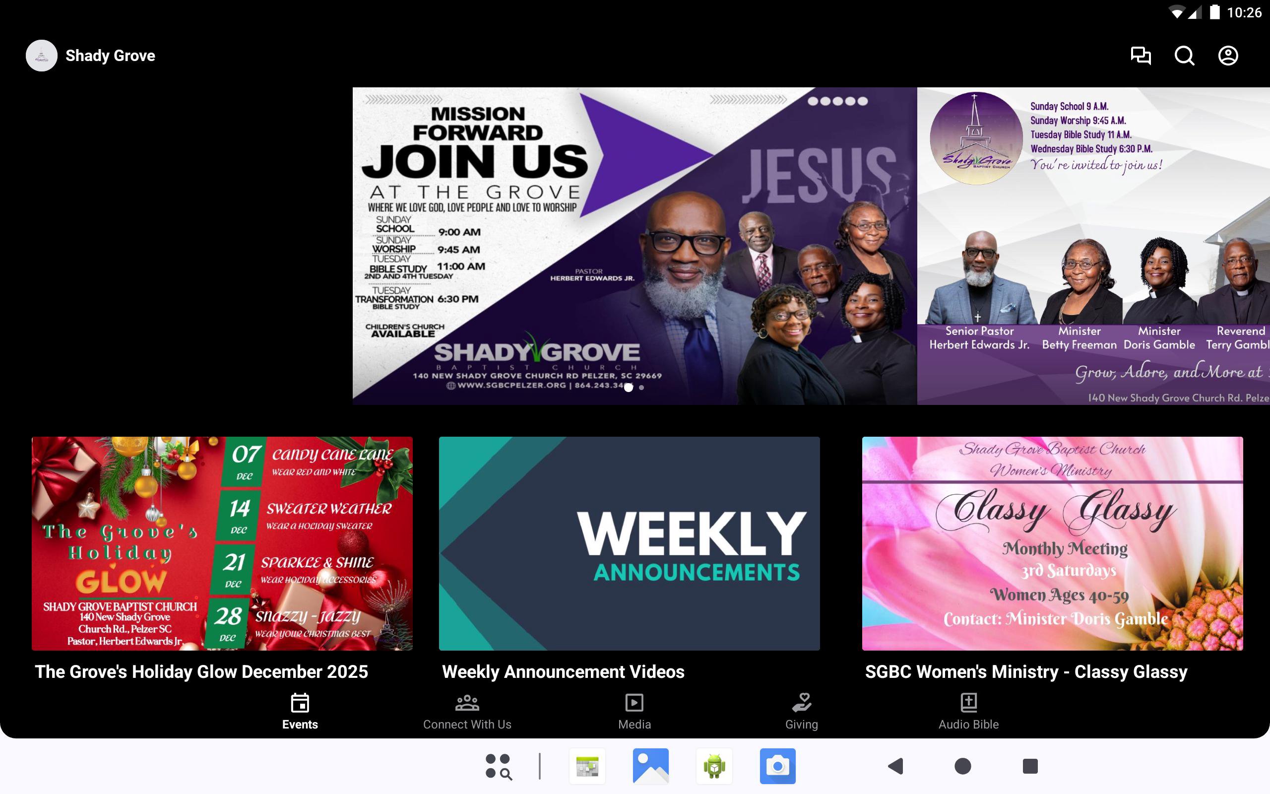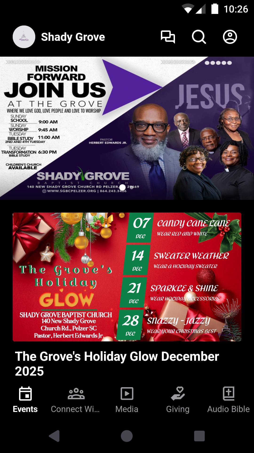 Welcome to the official Shady Grove Baptist Church Pelzer SC app. This app will help you stay connected with the day-to-day life of our church. With this app you can: watch or listen to past messages; stay up to date with push notifications; share your favorite messages via Twitter, Facebook, or email; and download messages for offline listening.